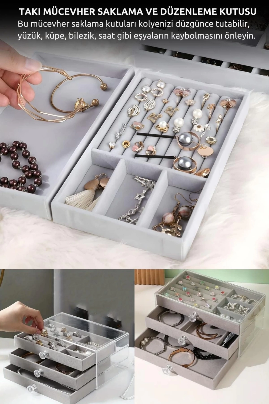 Değerli takılarınızı düzenlemek, korumak ve sergilemek için şık ve fonksiyonel bir çözüm mü arıyorsunuz? 3 Çekmeceli Kadife Takı Kutusu, tüm küpe, yüzük, kolye ve bilezik koleksiyonunuzu tek bir yerde toplamanızı sağlayan mükemmel bir takı düzenleyici çözümüdür. Bu zarif mücevher kutusu, estetik tasarımı ve akıllı bölmeleriyle makyaj masanızın vazgeçilmezi olmaya aday.