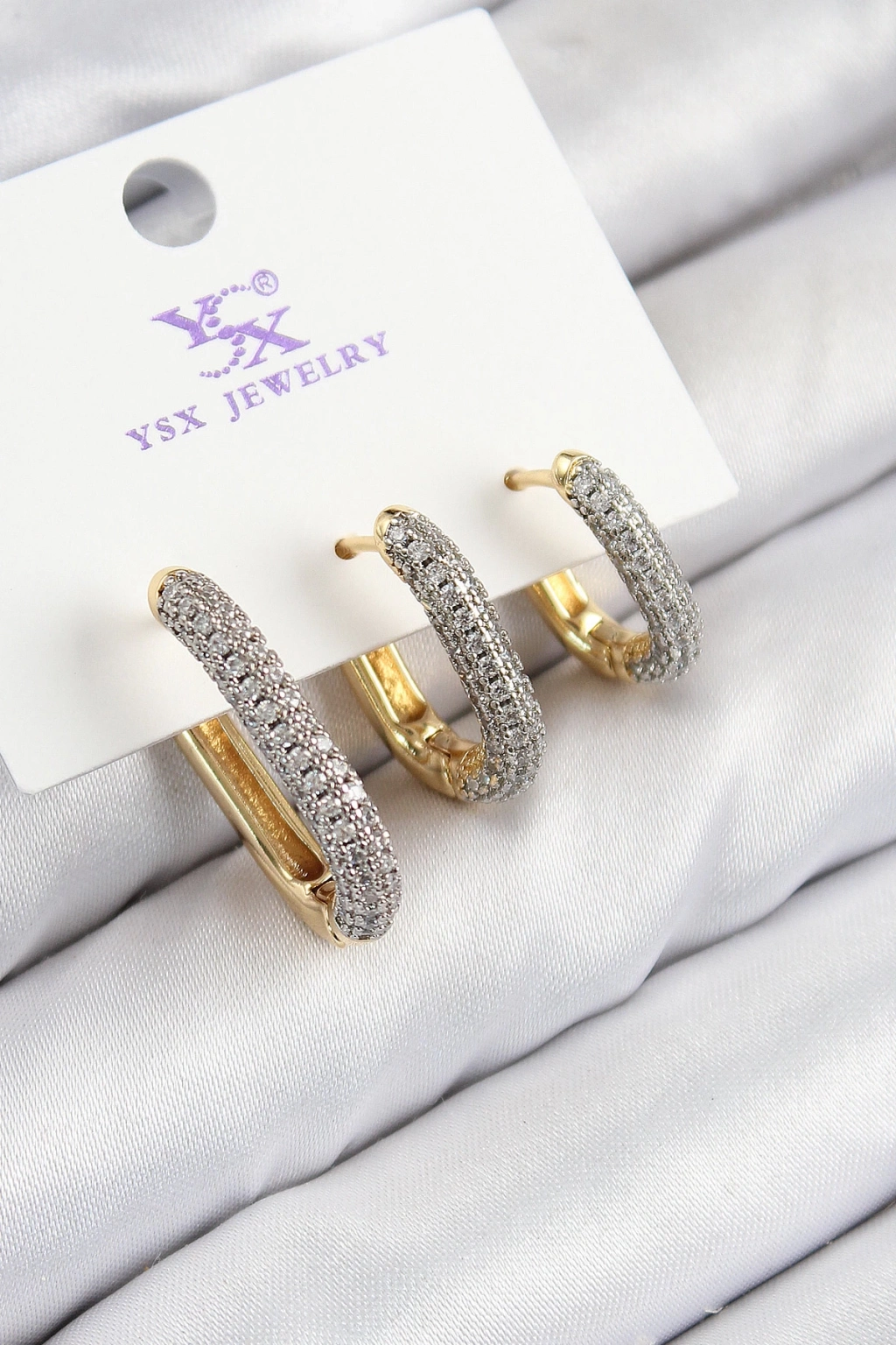 ÇOK SATAN Pirinç Zirkon Taşlı 3'lü Oval Dikdörtgen Model Gold Ve Gümüş Renk Kadın Küpe