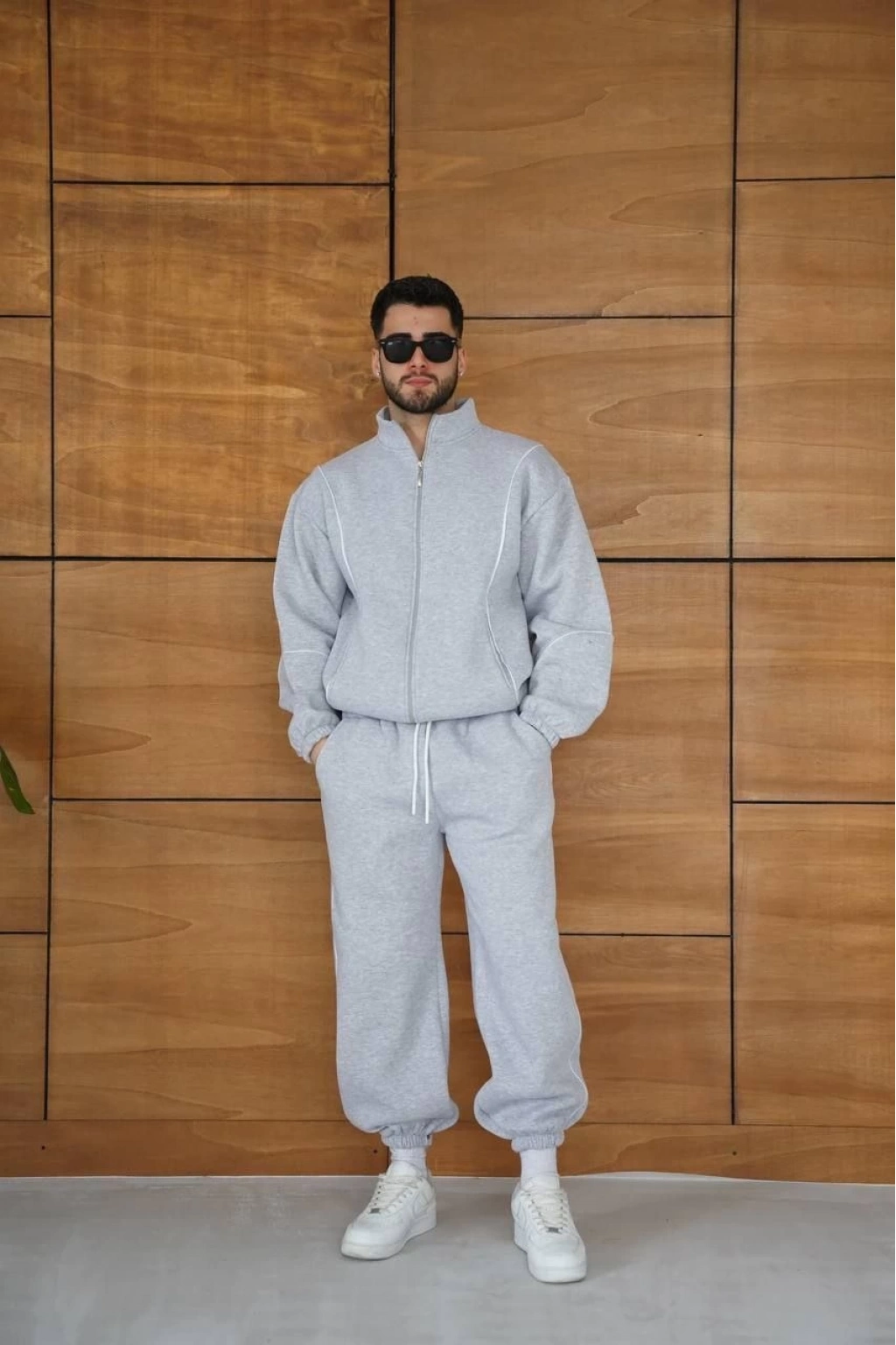 Premium Parçalı Eşofman Takım - Dik Yaka Fermuarlı Biyeli Sweatshirt Lastik Paça Alt, Oversize 3 iplik Şardonlu - Gri -