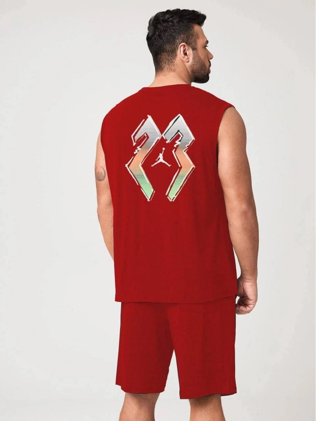 Sırt Baskılı Sıfır Kol İkili Şort Takım - Kırmızı