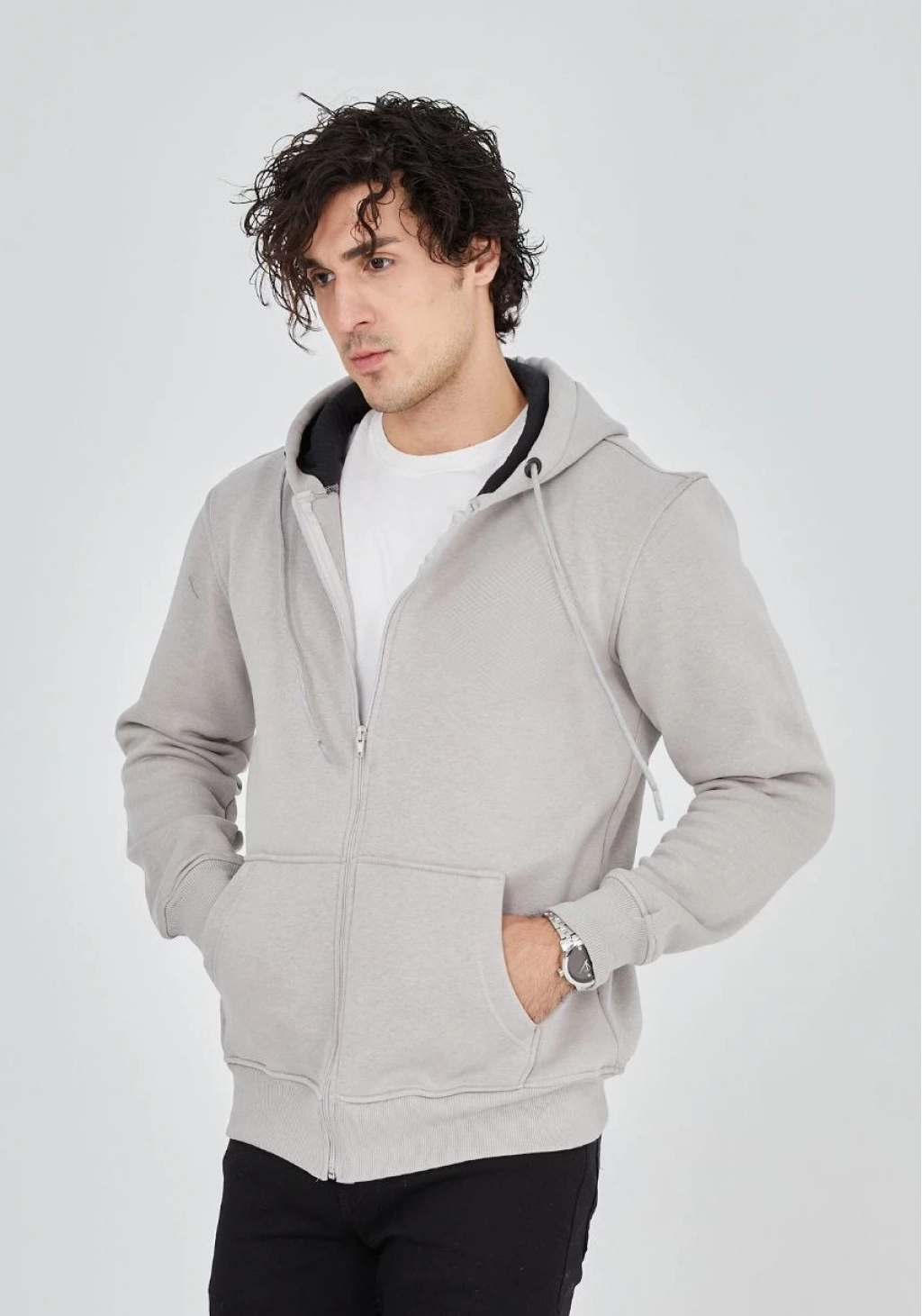 Tam Fermuarlı Kapşonlu  SweatShirt - Boyalı Gri