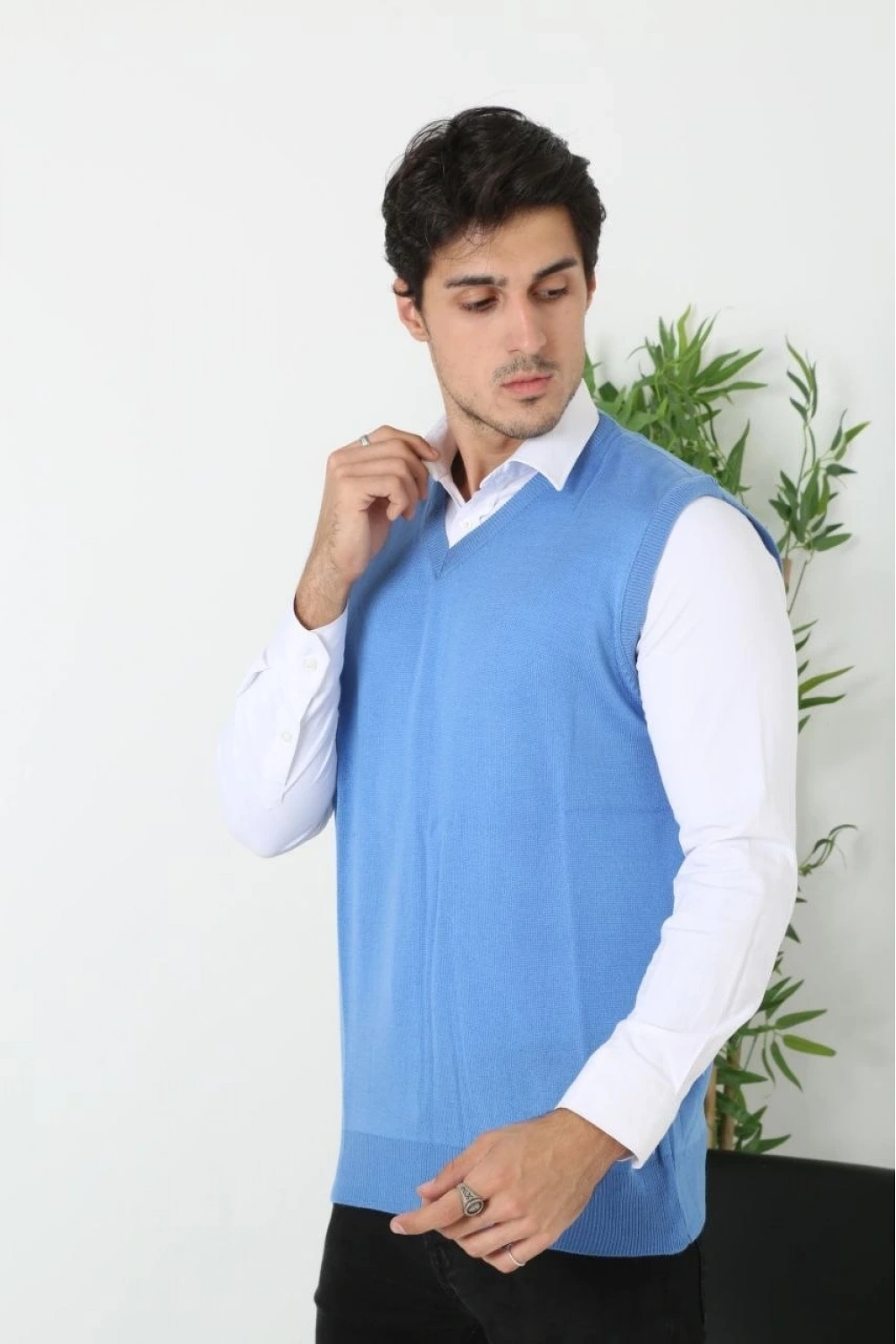 V Yaka Kolsuz Süveter Triko Kazak yumuşak dokulu Pamuklu ince Dokuma Rahat Regular kalıp - Mavi