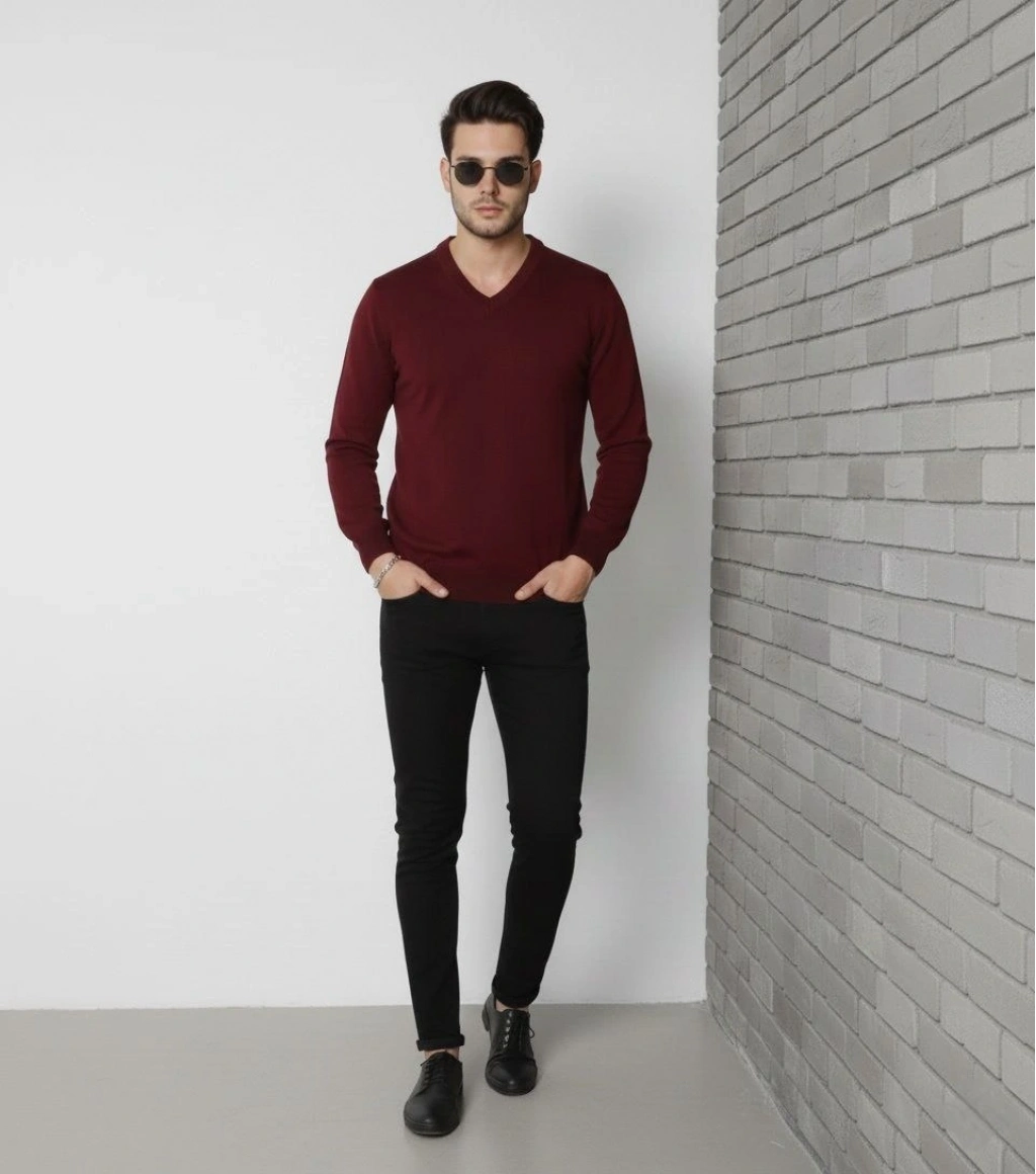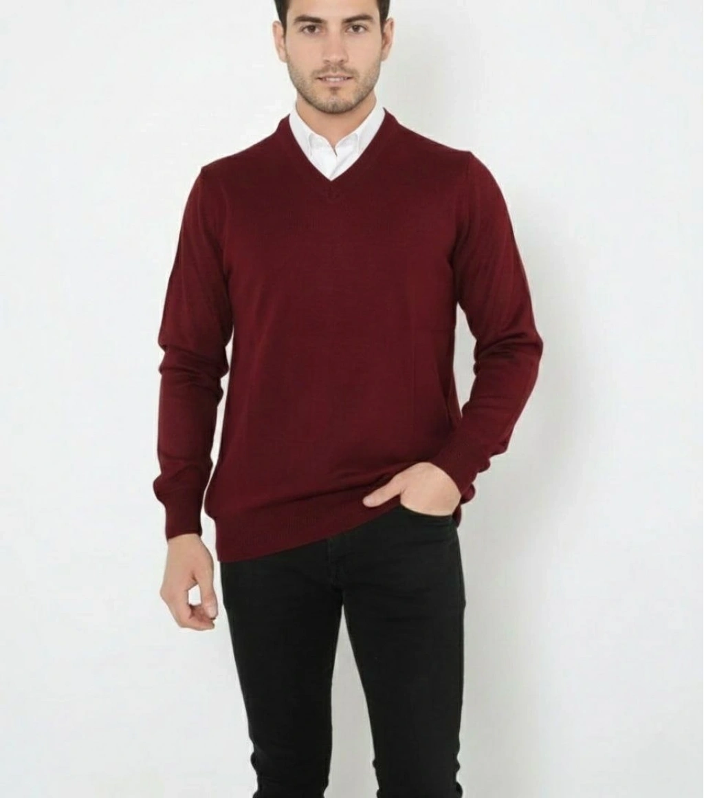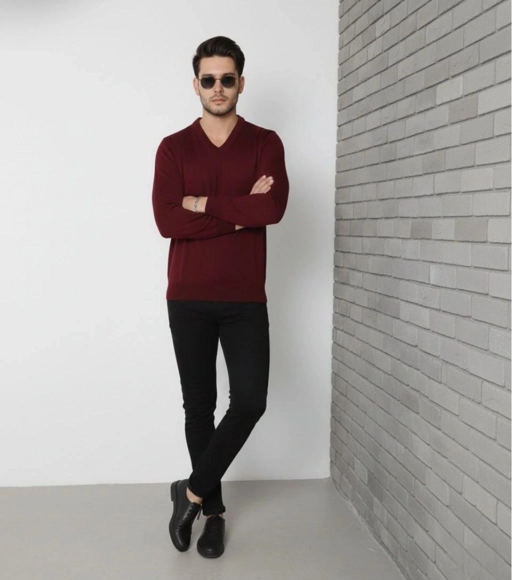 V Yaka Triko Kazak yumuşak dokulu Pamuklu ince Dokuma, uzun kollu Rahat Regular kalıp - Bordo