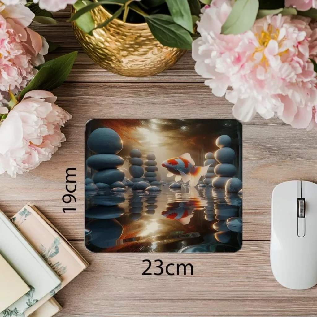 Dairesel yüzüş hareketiyle betimlenen koi balığı tasarımı, bu mousepad’e sakinlik ve estetik bir Japon esintisi katıyor.