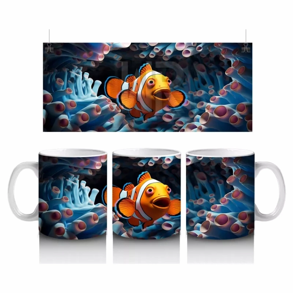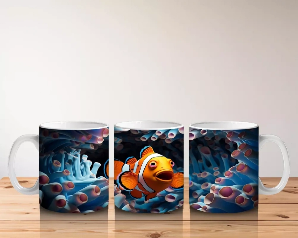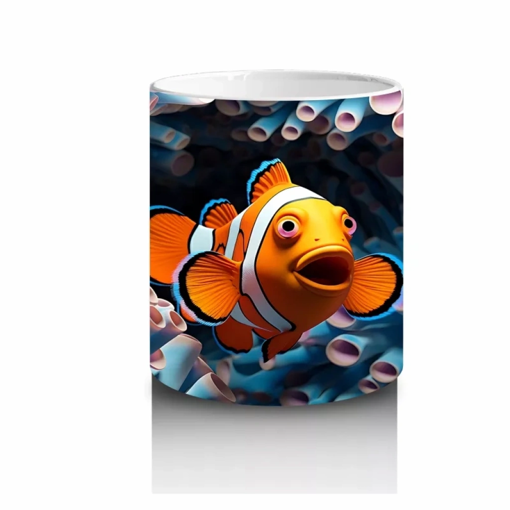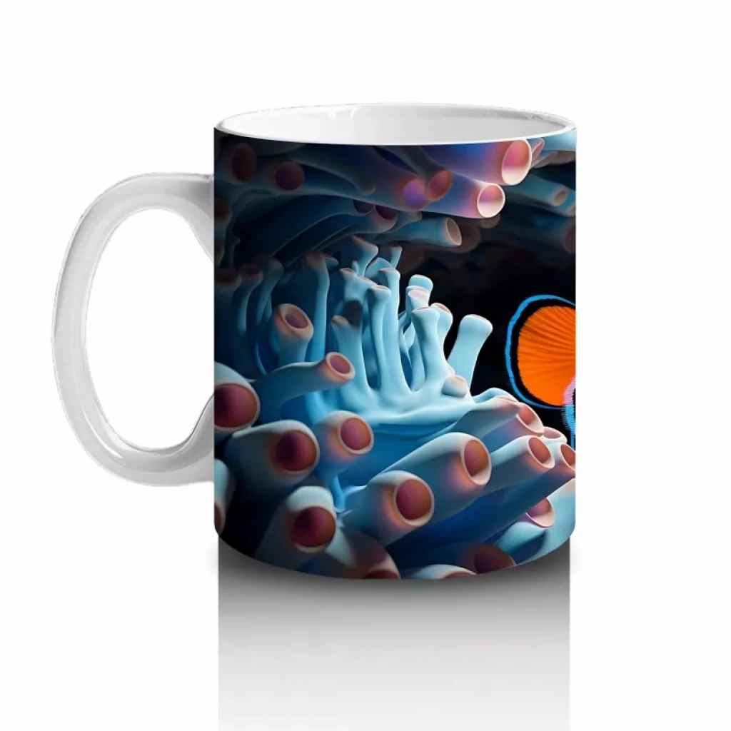 Dalgaların hareketiyle uyum içinde neşeyle süzülen palyaço balığı, deniz yaşamının canlılığını ve enerjisini yansıtıyor. Eğlenceli ve pozitif tasarımlar arayanlar için ideal bir kupa.