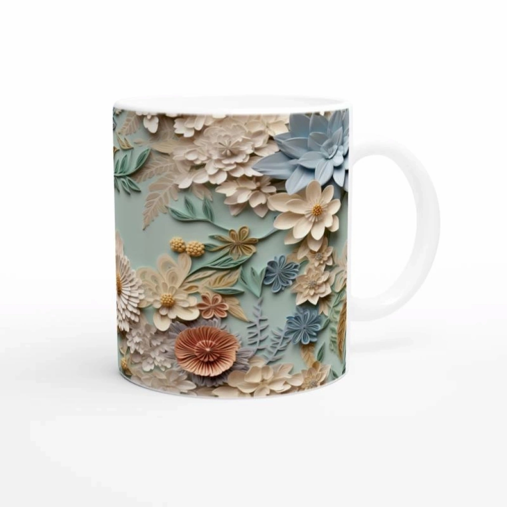 Nane yeşili arka plan üzerinde yükselen krem, açık mavi ve pastel turuncu tonlardaki rölyef çiçek desenleriyle bu kupa bardak, baharın tazeliğini ve doğallığını yansıtıyor. İnce işlenmiş yaprak motifl