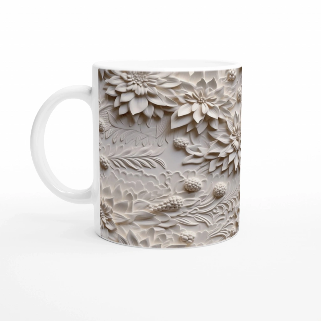 Dondurulmuş Krem Çiçekler Kupa Bardak, donmuş bir çiçek bahçesini andıran üç boyutlu yüzeyiyle hem modern hem klasik dekorlara uyum sağlar.