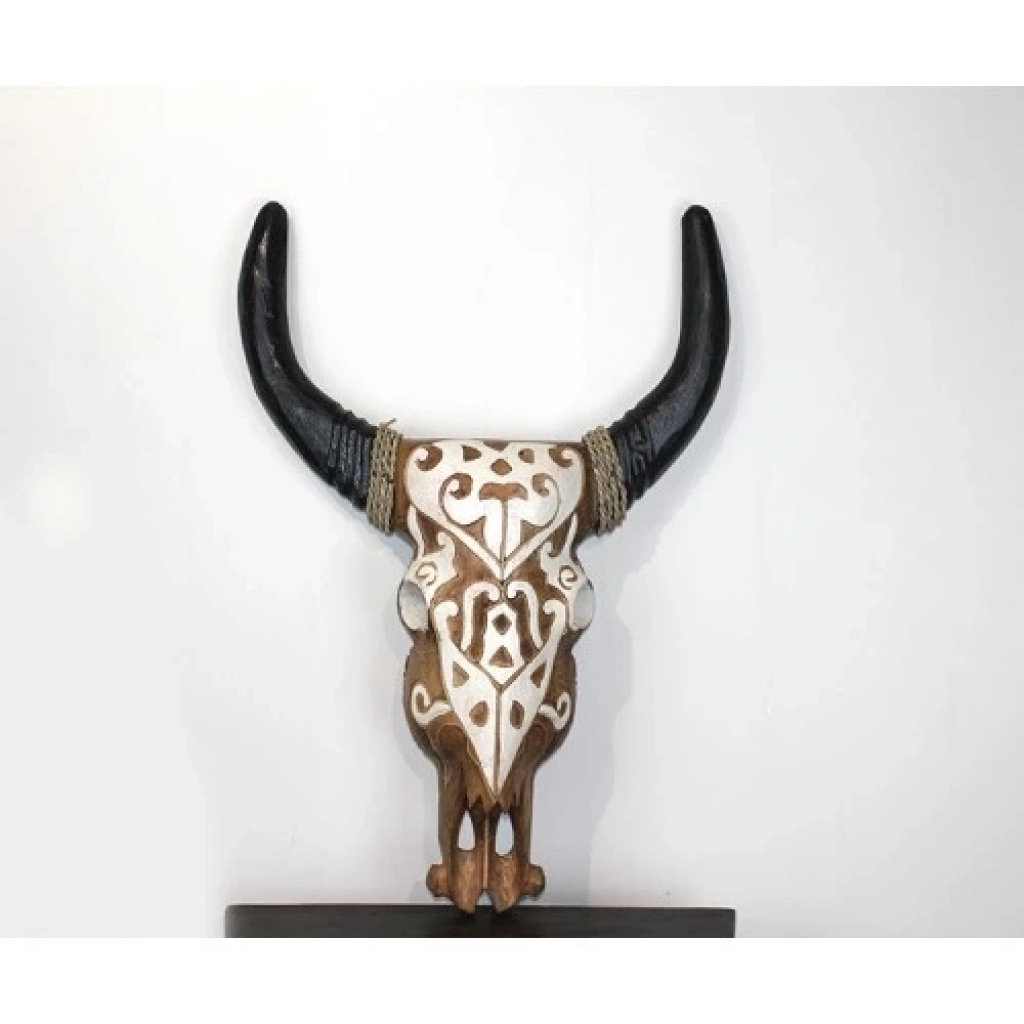 DUVARA ASMALI BUFALO KAFASI Ürün ÖzellikleriBu dekoratif bufalo kafası, şık tasarımı ve geleneksel motifleriyle ev dekorasyonuna zarif bir dokunuş katar. Yüksek kaliteli malzemelerden üretilmiş olan kafanın boyutları 75x45 cm olup, duvara asılabilir ve dikkat çekici bir görünüm sağlar. Siyah boyalı büyük boy boynuzlar ve beyaz-sarı desenli yüzey, ürünü estetik açıdan etkileyici kılar.Mekânınıza rustik, bohem veya doğal bir hava katmak için mükemmel bir seçenektir.Paket İçeriği1 Adet Duvara Asmalı Bufalo Kafası