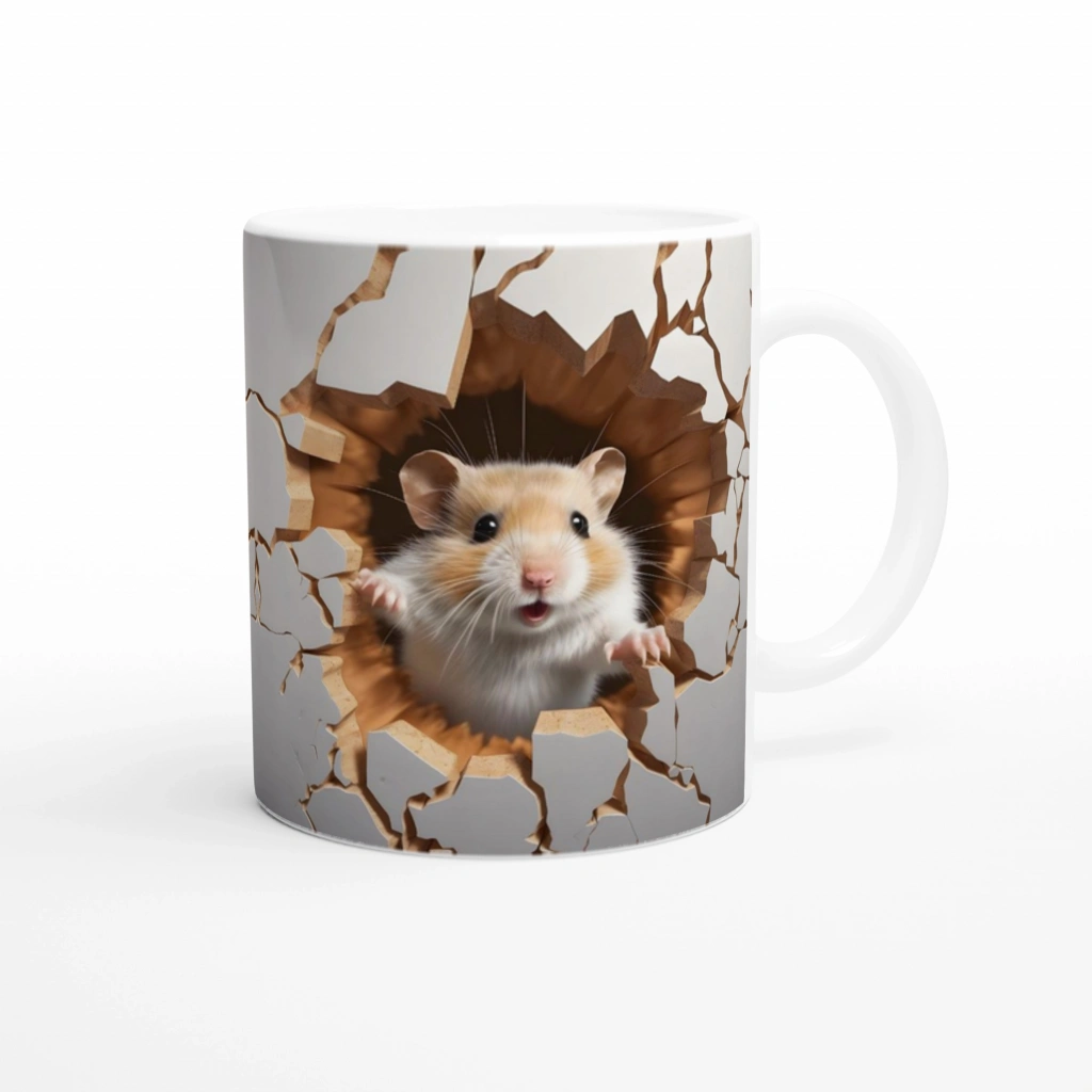 Duvarı Delen Sevimli Hamster Baskılı Kupa Bardak, 3D yırtılmış duvar efektiyle sanki içinden fırlayan tatlı bir hamster’ı sunuyor. Hem esprili hem sevimli bu tasarım, hayvan severler ve enerjik hediyeler arayanlar için ideal. Kahvenizi yudumlarken her bakışta sizi gülümsetecek bir detay!