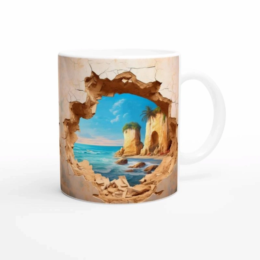 Duvarı Delen Tropik Sahil Manzaralı Baskılı Kupa Bardak, çatlak bir duvarın ardından beliren masmavi deniz, altın rengi kayalıklar ve palmiye ağaçlarıyla tropik bir kaçış hissi yaratır. Doğayla iç içe bir estetik arayanlar için ideal bir hediye seçeneğidir.
