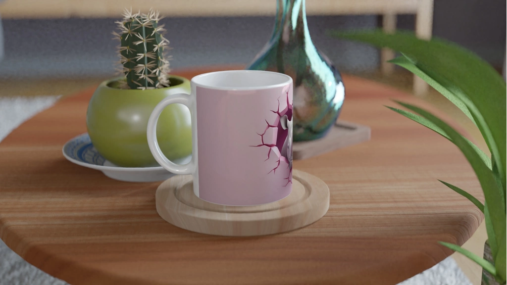 Duvarı parçalayarak çıkan gergedan figürü, pembenin yumuşaklığıyla tezat oluşturarak çarpıcı bir görsellik sunuyor. Doğaya hayran olanlar için sıra dışı ve güçlü bir kupa tasarımı.