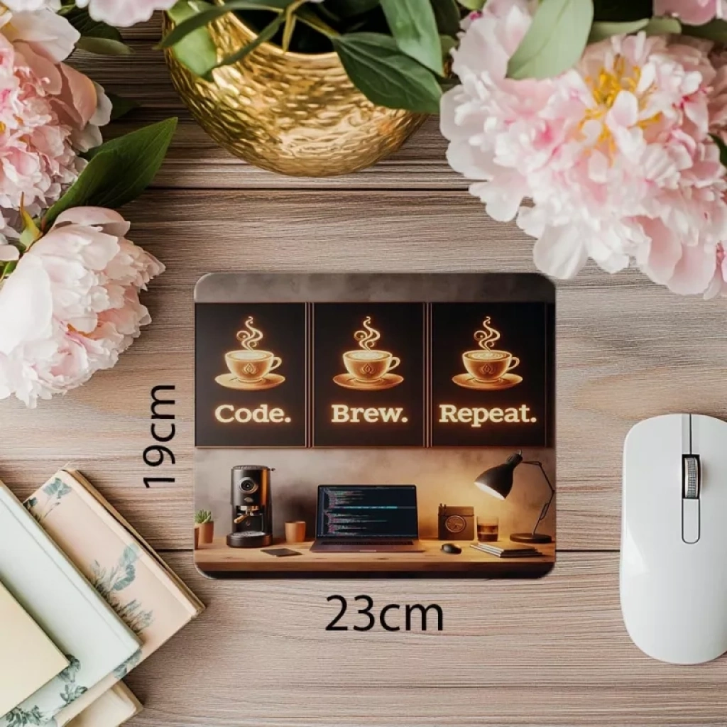 Espresso setup altında güçlü kod sloganının yer aldığı mouse pad, pürüzsüz kaydırma yüzeyi ve kaymaz tabanıyla hem estetik hem konforlu kullanım sunar.