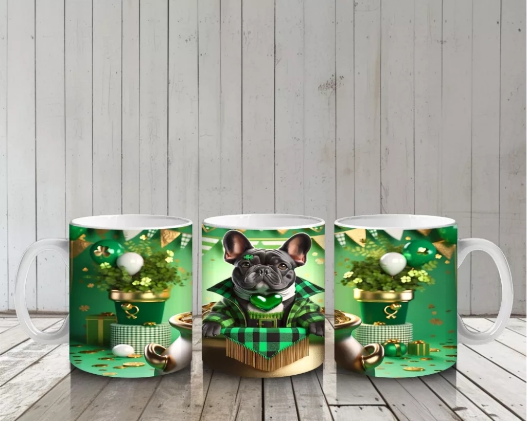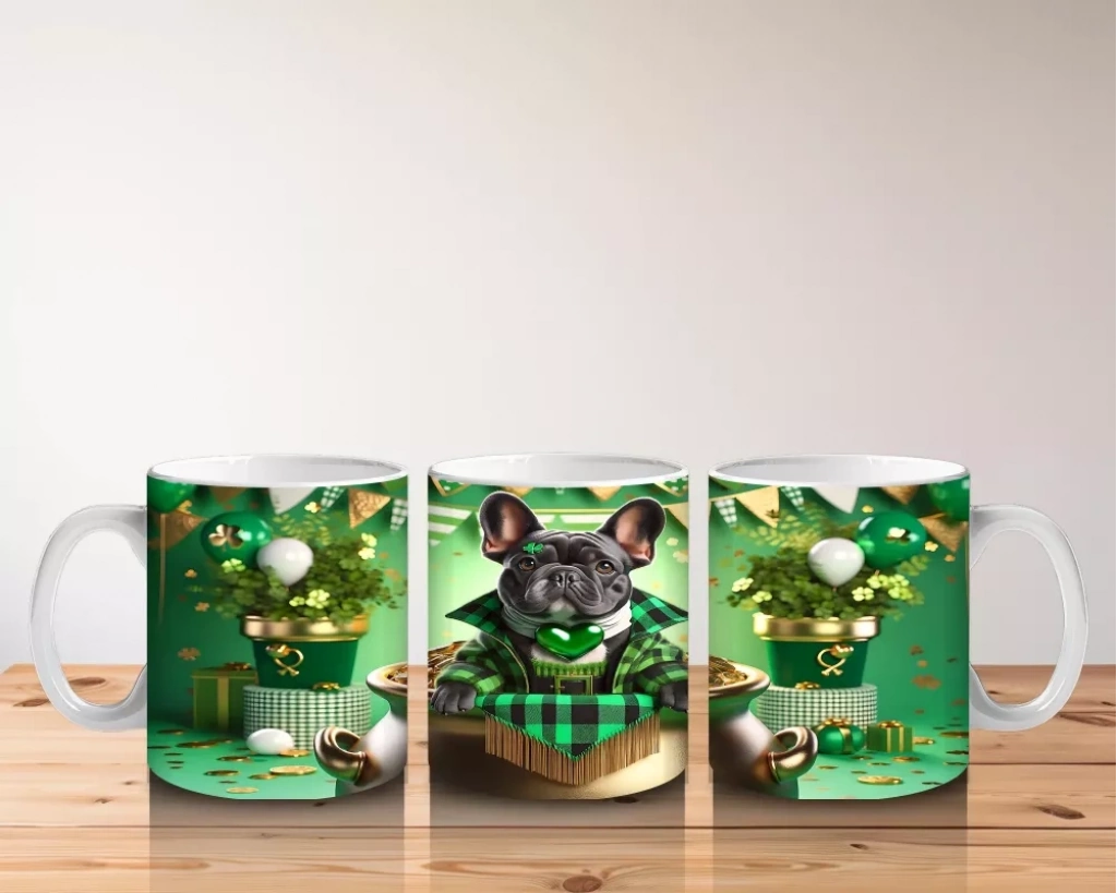 Fransız Bulldog ile St. Patrick Partisi – Altın Kazanlı Eğlenceli Kupa Tasarımı