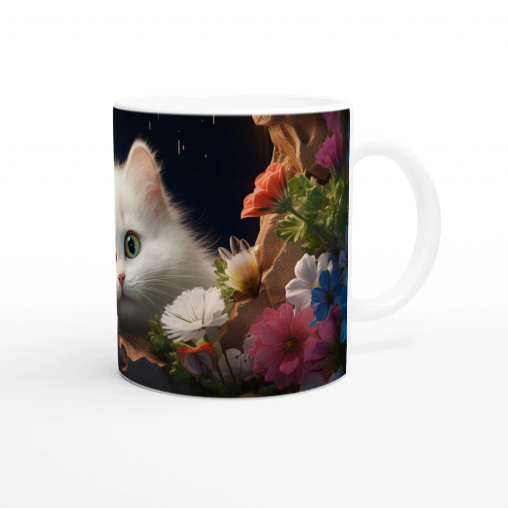Gece Bahçesinde Parlayan Gözlü Beyaz Kedi Baskılı Kupa Bardak, hayal gücünü harekete geçiren detayları ve zarif renk geçişleriyle hem dekoratif hem de koleksiyonluk bir parçadır.