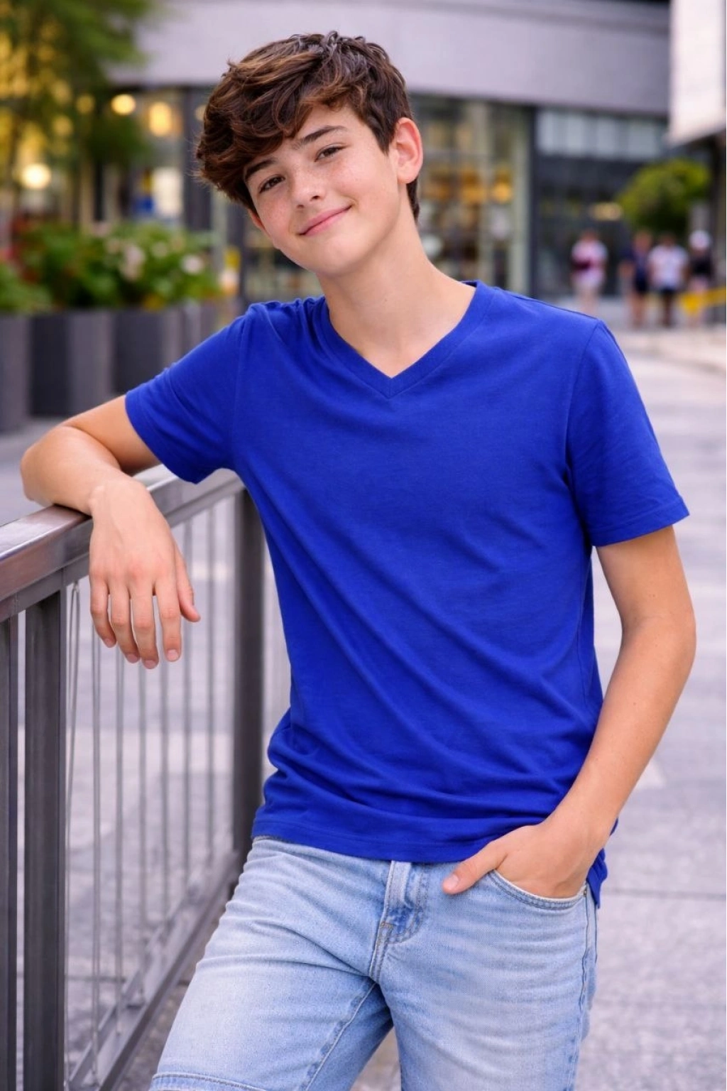 Genç Erkek Çocuk V Yaka Tişört Yazlık Model Günlük Basic Body - Saks Mavisi