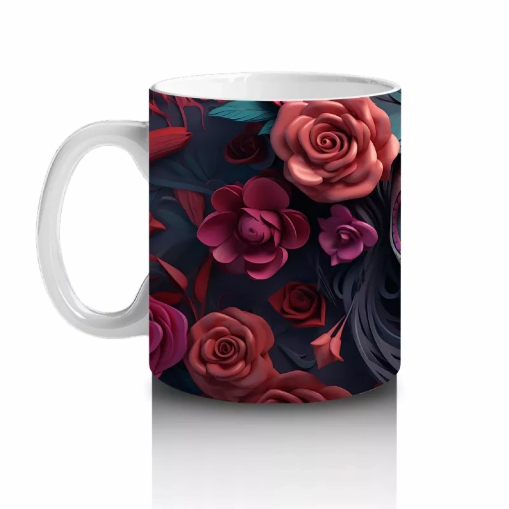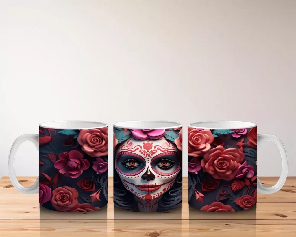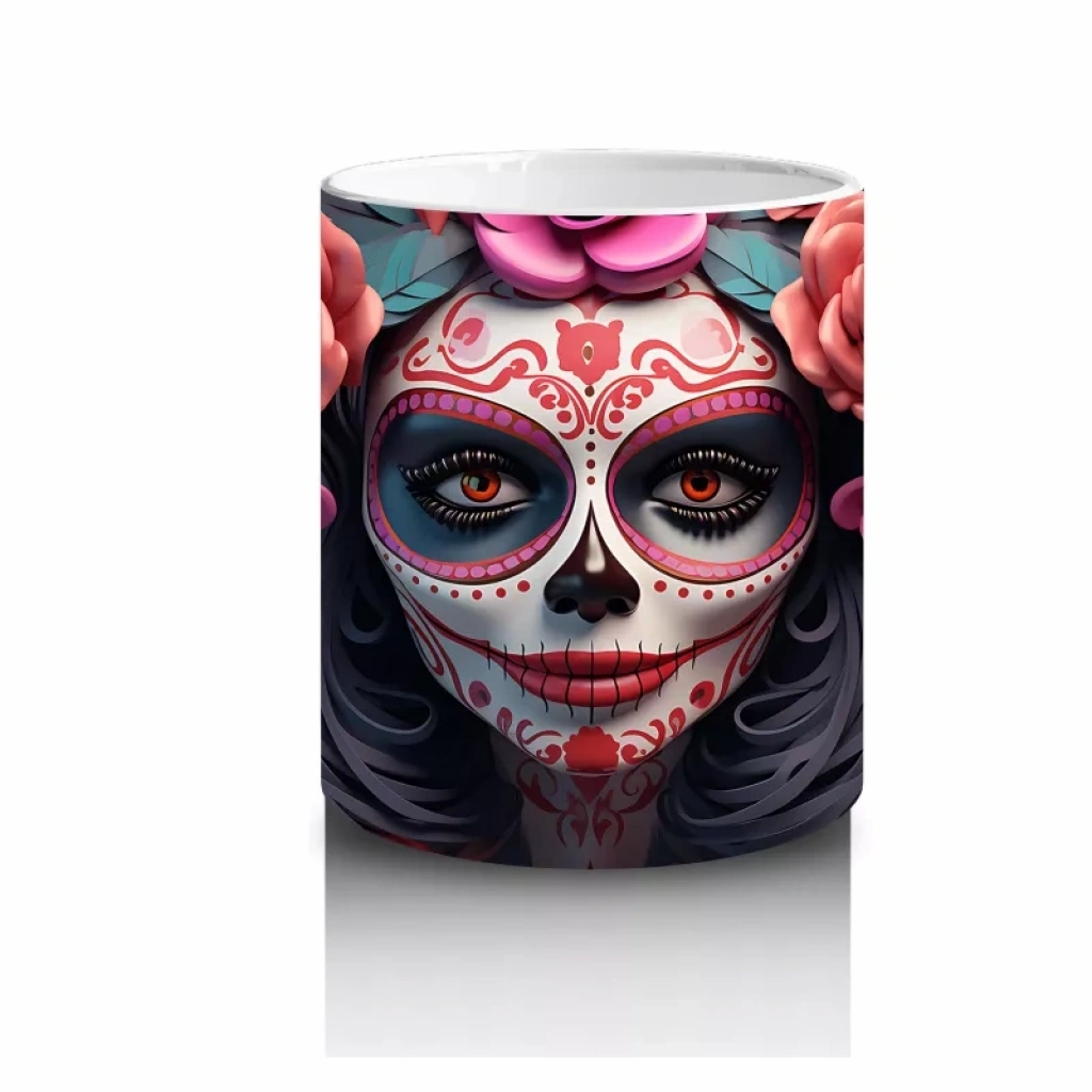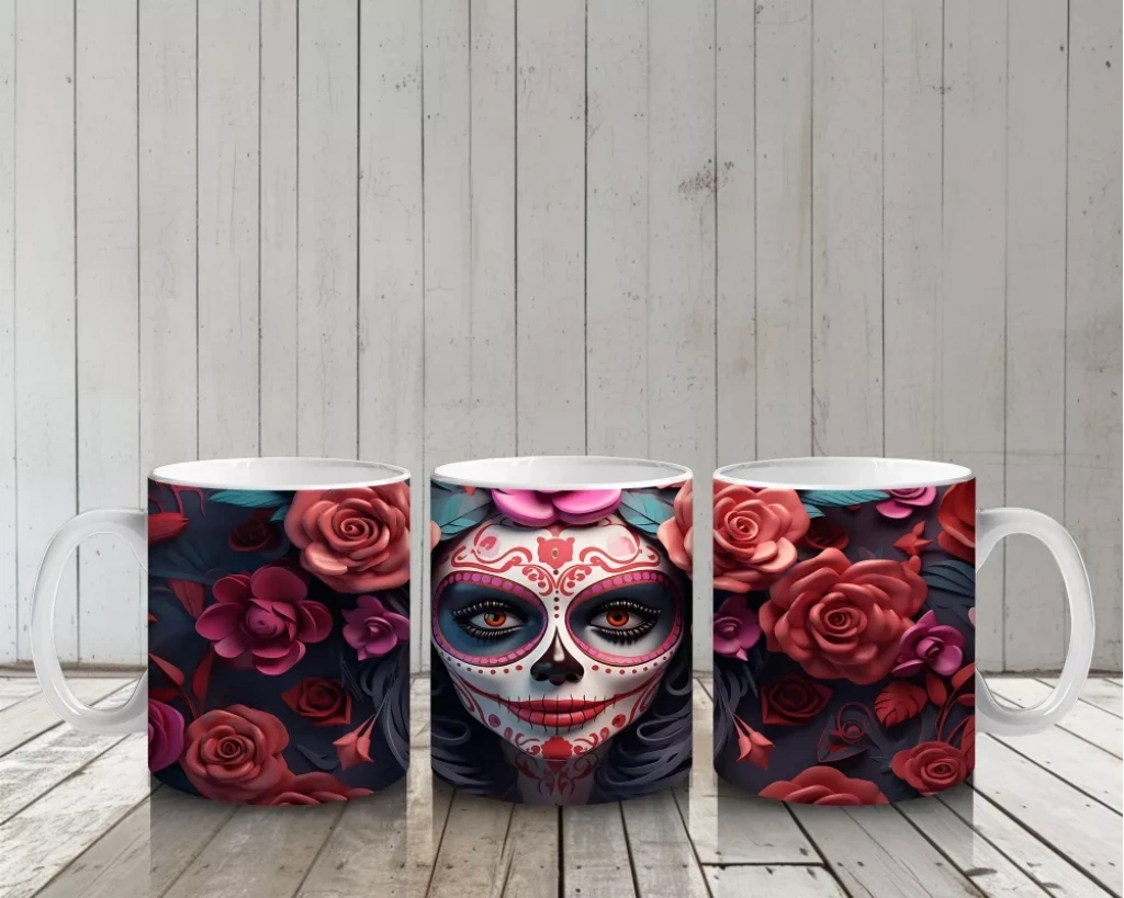 Gül Taçlı Renkli Maske – Hediyelik Kahve Kupası Renkli maskesi ve gül tacıyla büyüleyici bir görünüm sunan bu Cadılar Bayramı temalı baskılı kupa, hem eğlenceli hem estetik bir hediyelik kahve kupası alternatifidir.