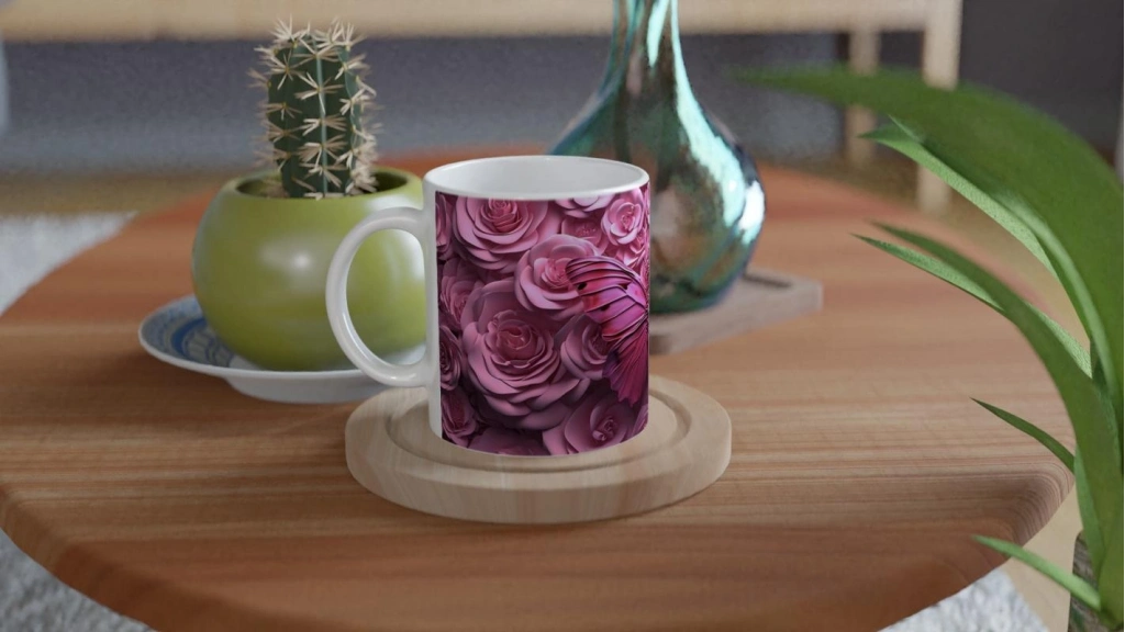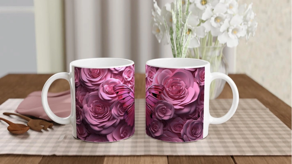 Güller Arasında Pembe Kelebek Temalı Baskılı Kupa Bardak, 3D dokulu görünümüyle göz alıcı bir tasarıma sahiptir. Hem görsel açıdan zengin hem de hediye olarak ideal bir seçenek sunar.