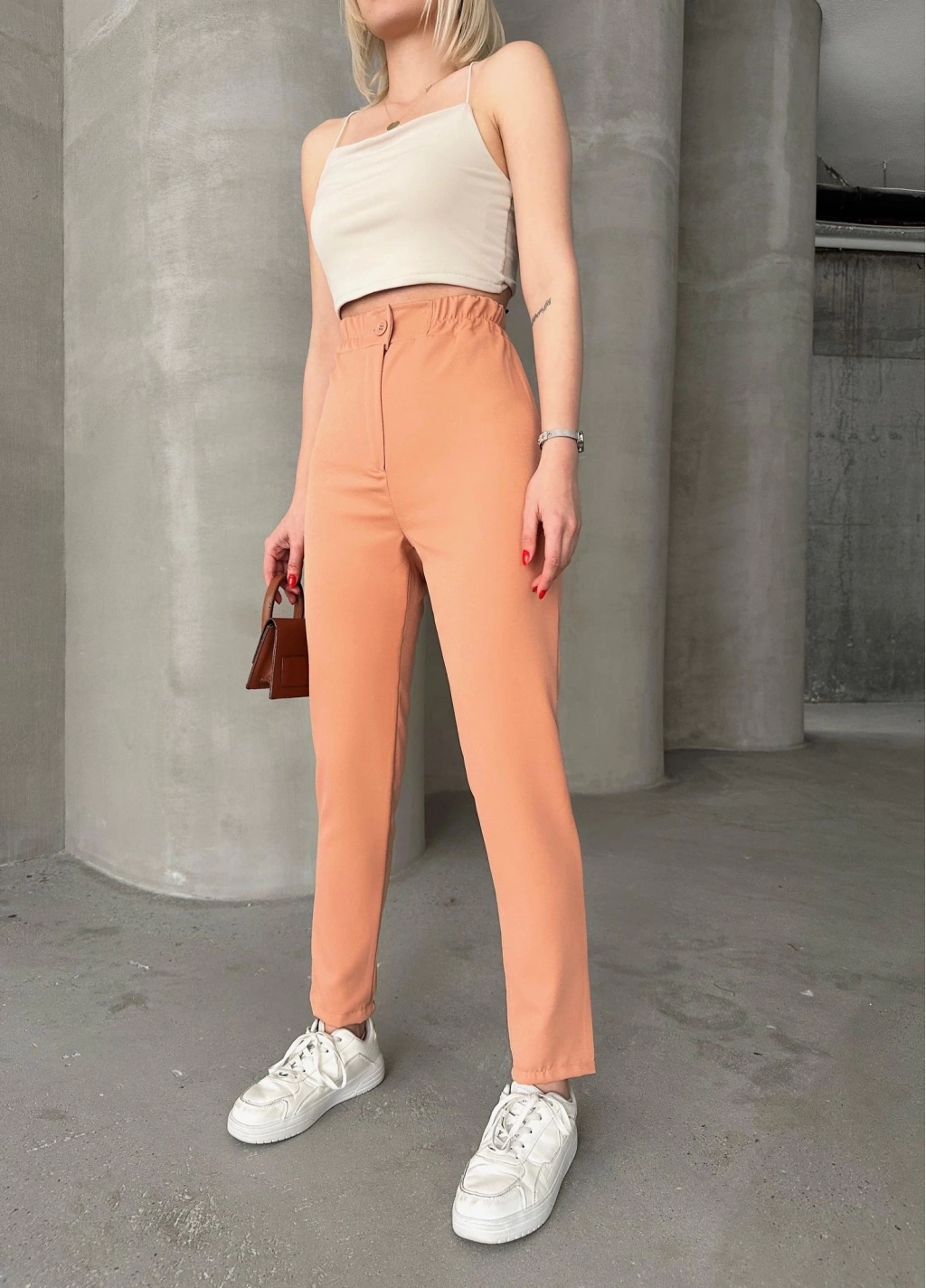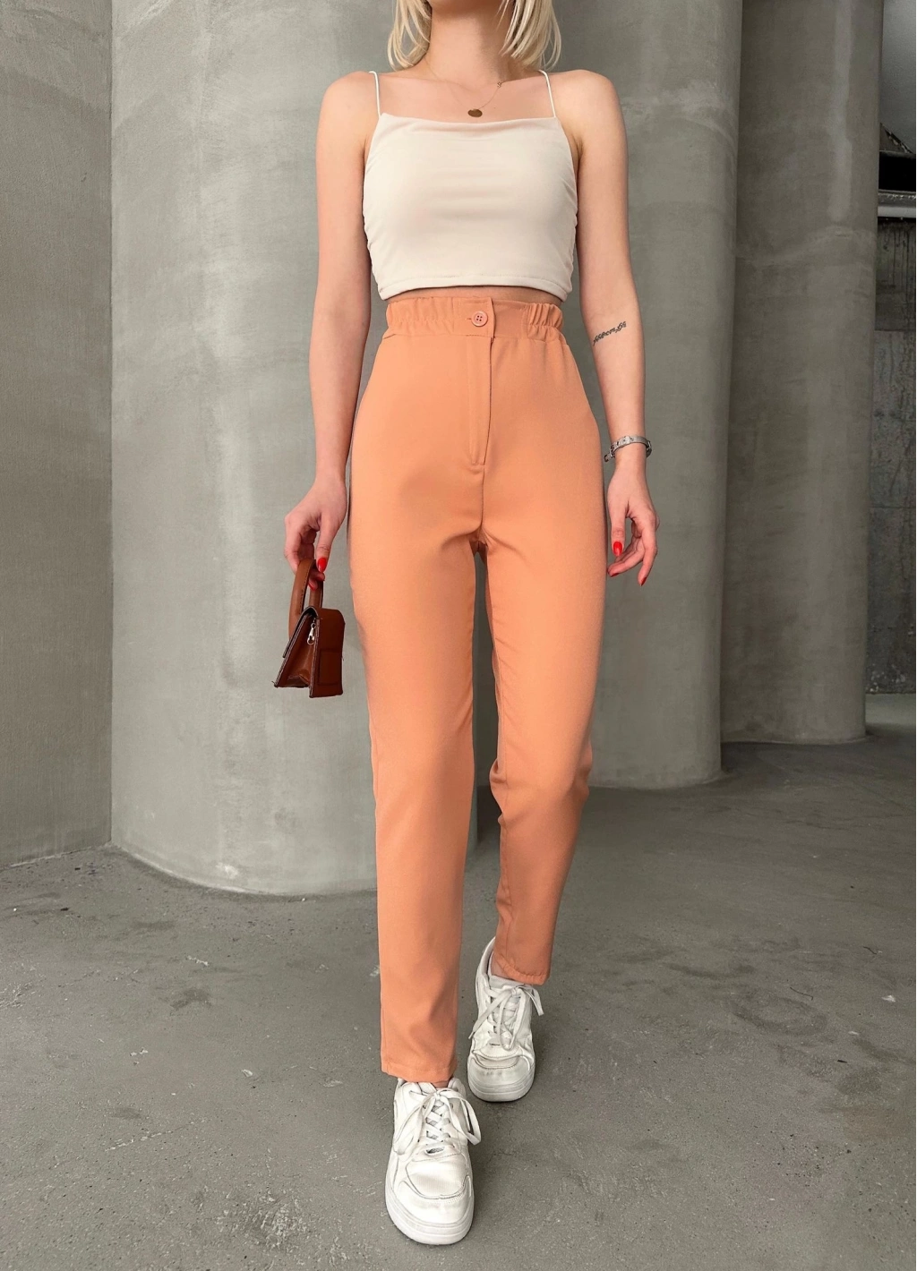 Beli lastikli karamel pantolon, hem şık hem de rahat bir seçenektir.