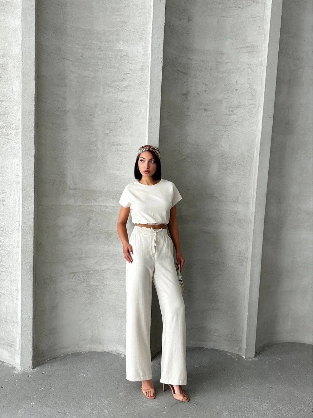 • Bluzunun düz kesimi ve pantolonunun yüksek bel tasarımı ile trend bir stil sunar.