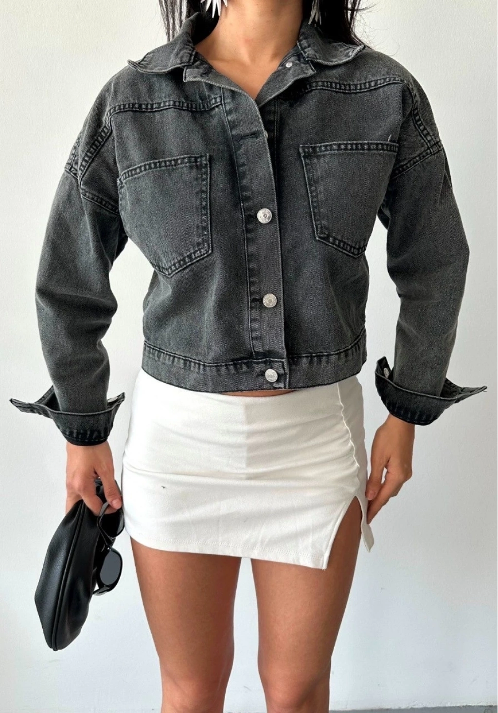 Yeni sezonda sokak modasına yön veren çift cepli kol katlamalı süper taş enzim yıkama crop kot ceket ile tarzınızı ön plana çıkarın.