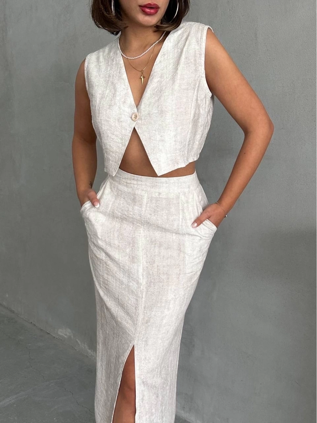 ÇOK SATAN markasının şık ve zarif tasarımıyla öne çıkan çilek takımı, etek ve yelek kombinasyonuyla dikkat çekiyor.