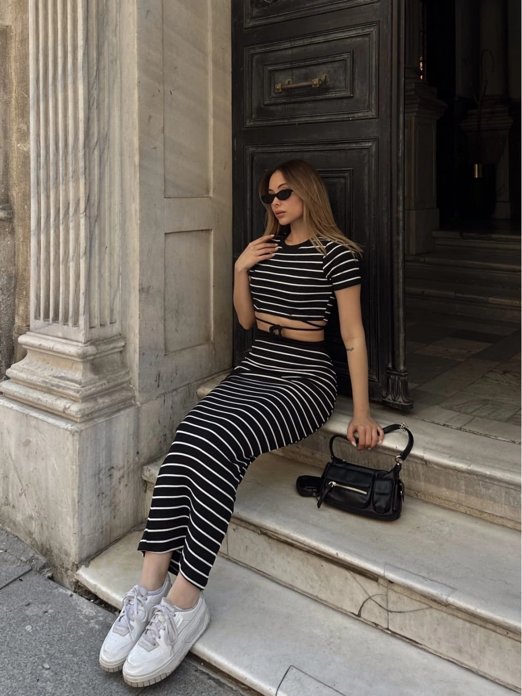 Bu siyah çizgili etekli takım, şıklık ve rahatlığı bir arada sunuyor. Hem günlük kullanıma hem de özel davetlere uygun olan bu takım, gardırobunuzun vazgeçilmezi olmaya aday.