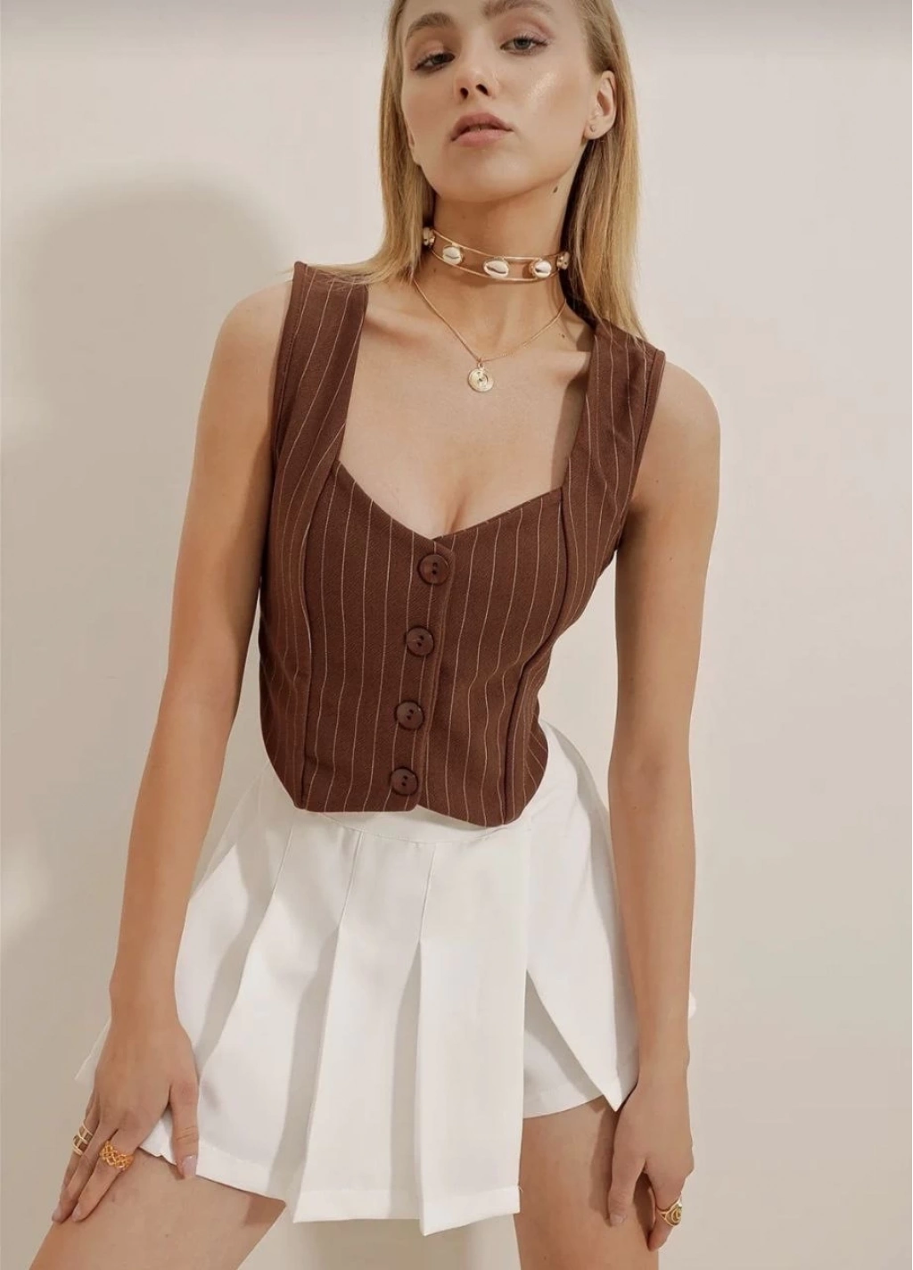 Bu sezonun trendi olan çizgili krep düğmeli yelek kahve rengiyle gardırobunuza şıklık katacak bir parça. S3395 modeli ile şık ve rahat bir görünüm elde edebilirsiniz.