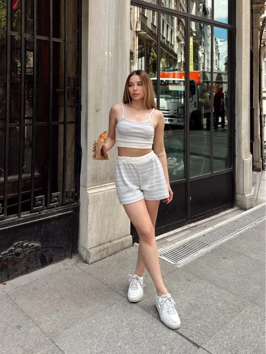 Bu sezonun trendlerinden biri olan çizgili şortlu takım gri S3978, şıklığı ve rahatlığı bir arada sunar.