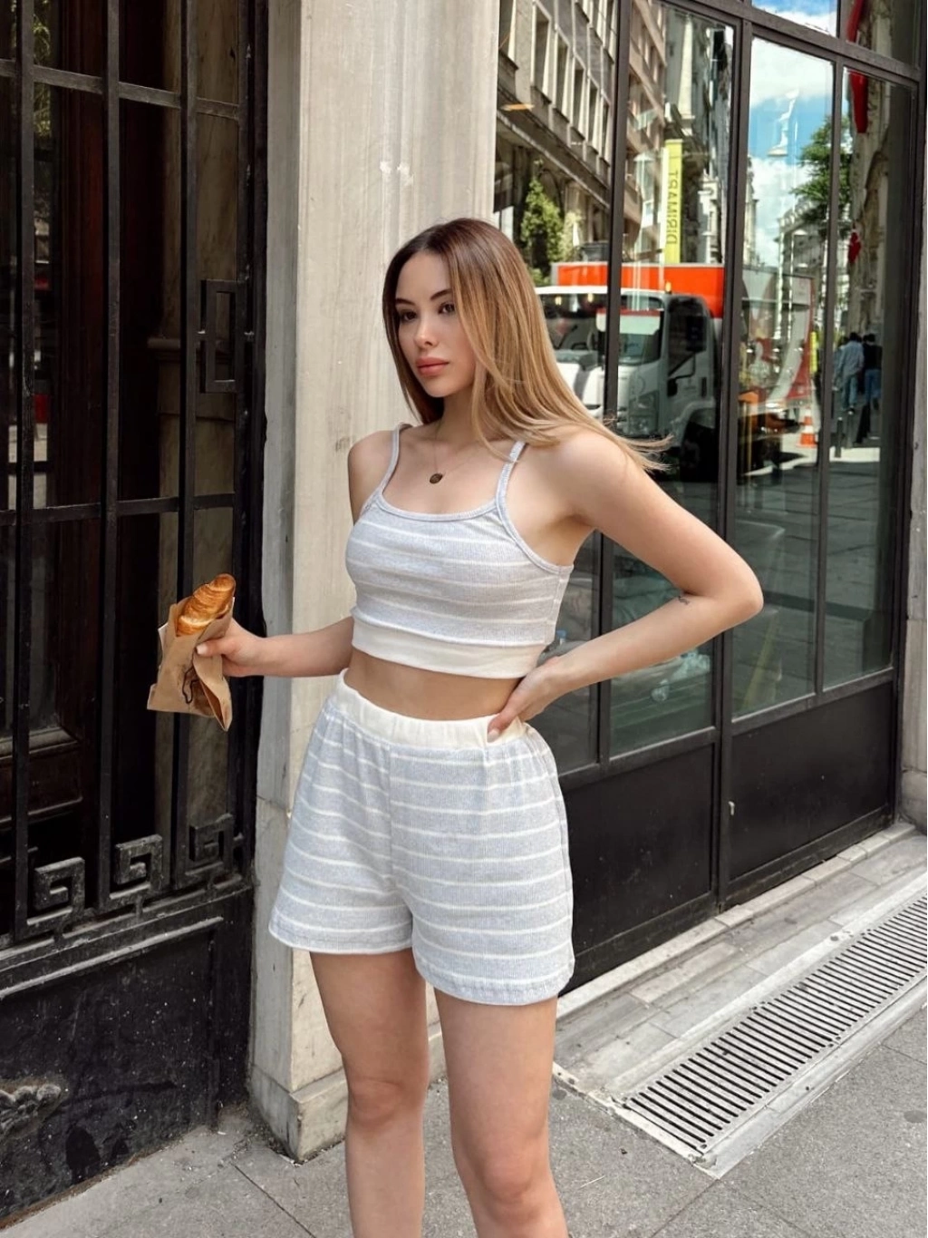 Şıklık ve konforu bir arada arayan kadınların tercihi olan çizgili şortlu takım gri S3978, gardırobunuza şıklık katacak!