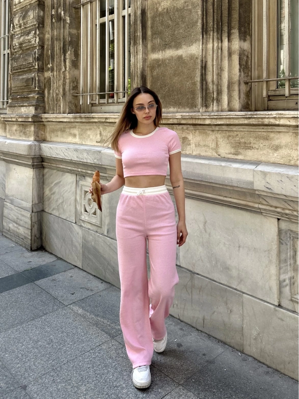 Crop pantolon biyeli takım pembe