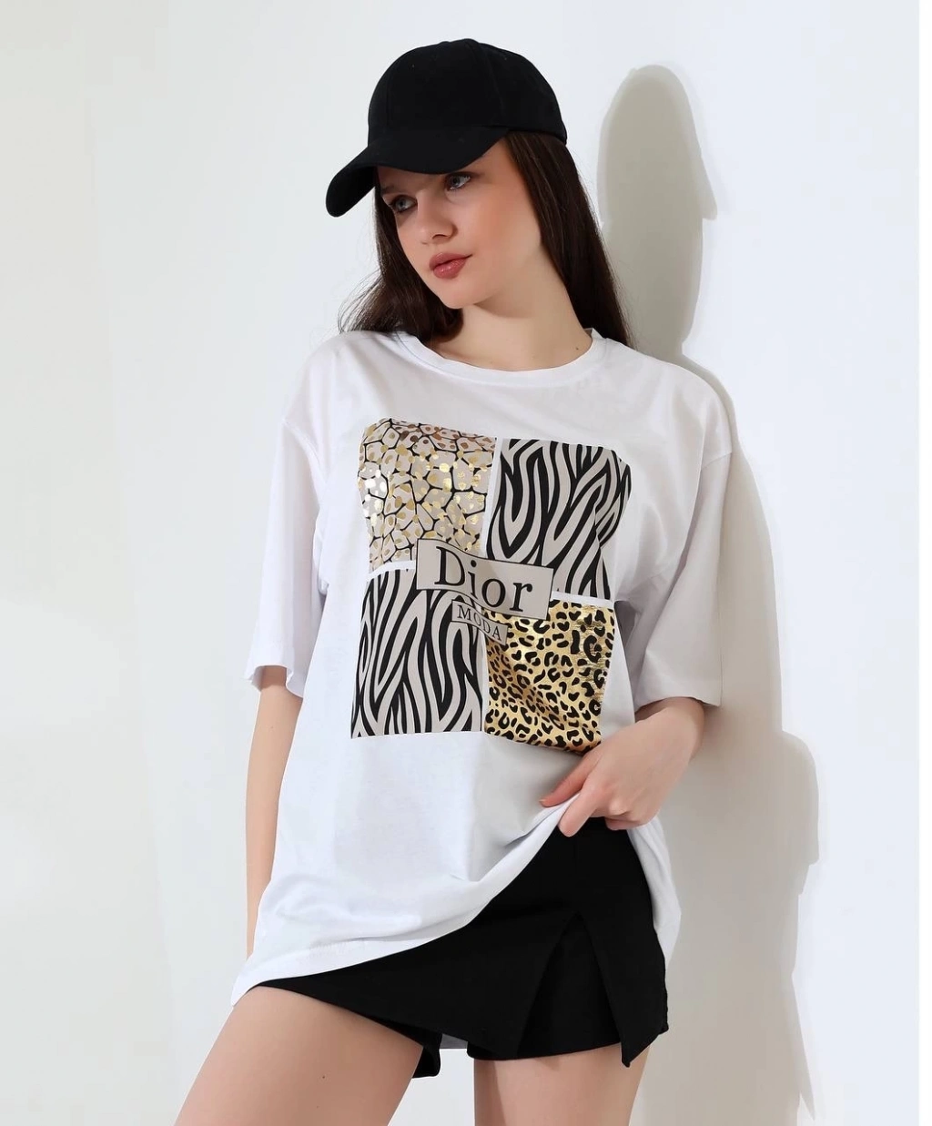 sının şık ve rahat tasarıma sahip karma desenli oversize tişörtü, şıklığı ve konforu bir arada sunar.