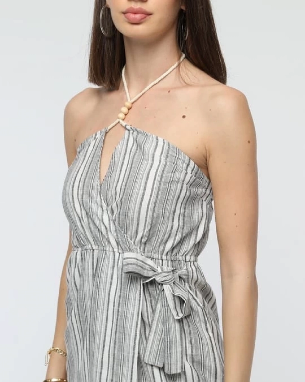 Kuşaklı çizgili mini keten elbise
