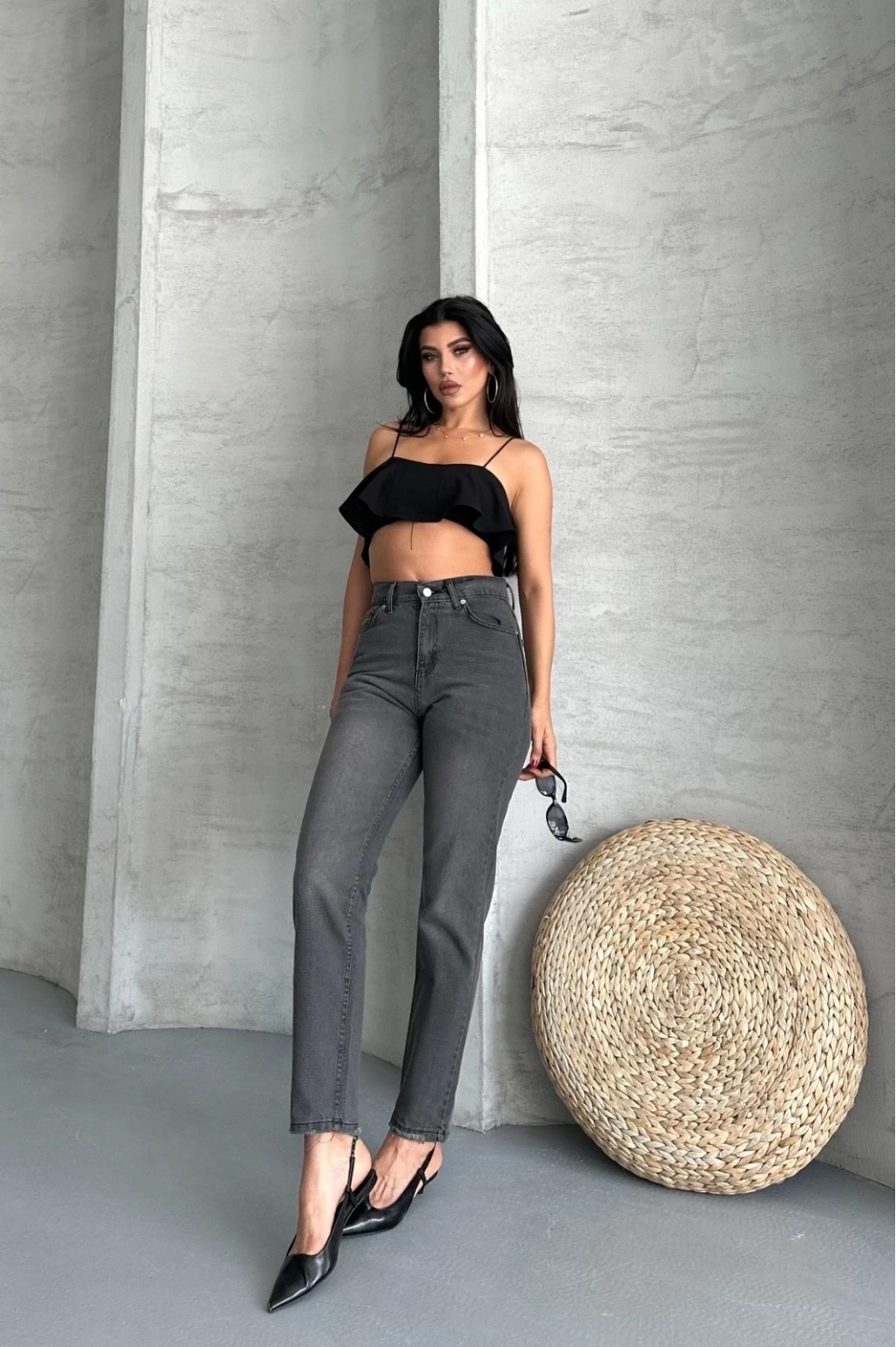 Mom fit enzim taş yıkama jeans pantolon füme d2006