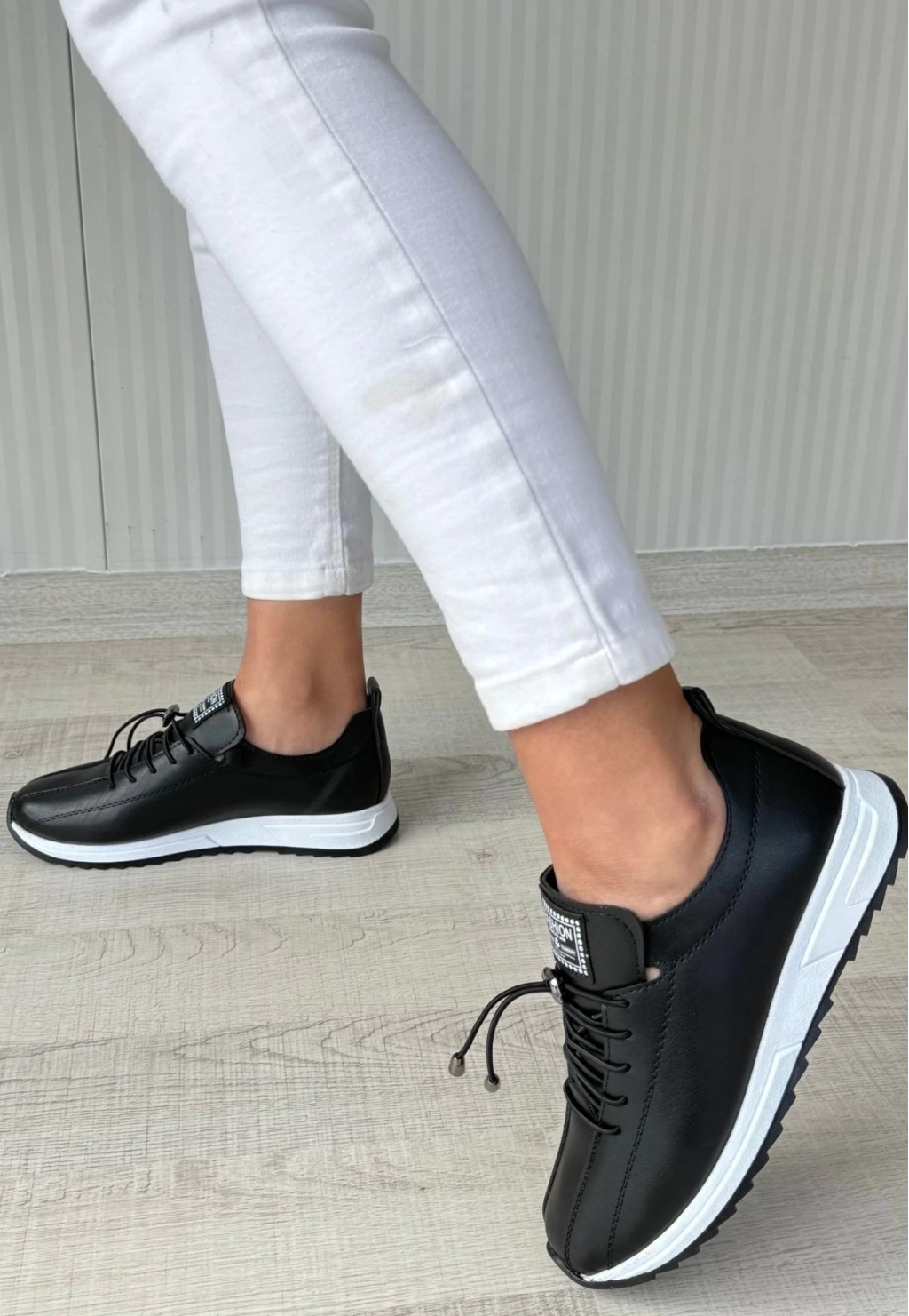 Monya Siyah Cilt Bağcıklı Spor Ayakkabı