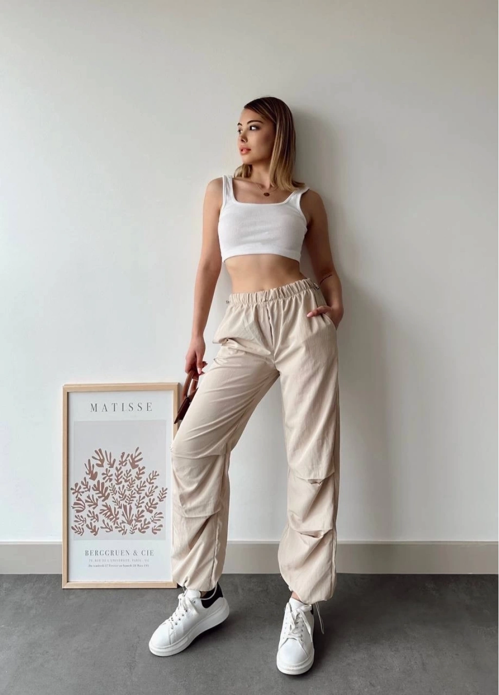 Şık ve rahatlık arayan kadınlar için ideal bir seçenek olan Bej Paraşüt Pantolon, gardırobunuzun vazgeçilmez parçalarından biri olmaya aday!