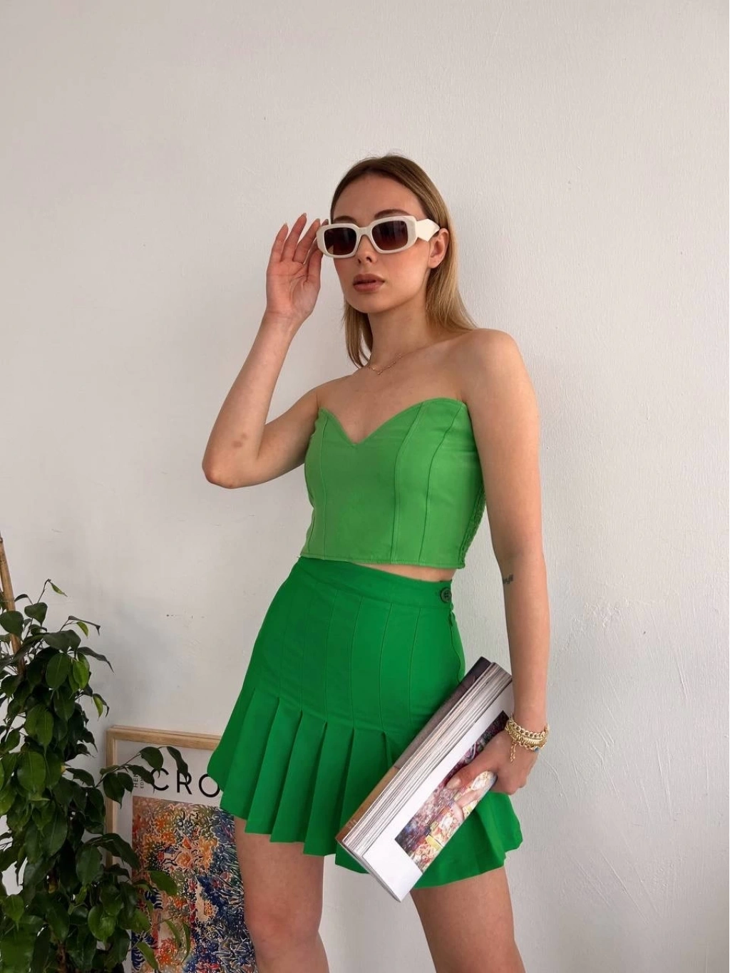 Açık yeşil rengi ile doğanın tazeliğini yansıtan bu etek, her mevsim kolaylıkla kombinlenebilir özelliğiyle dikkat çekiyor.