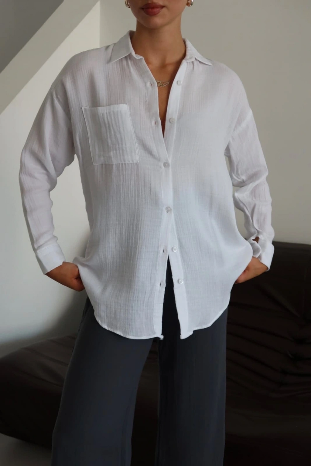 Beyazın sadeliği ve şıklığı ile tek cepli müslin gömlek, günlük şıklığınızı tamamlamak için ideal bir seçenektir.