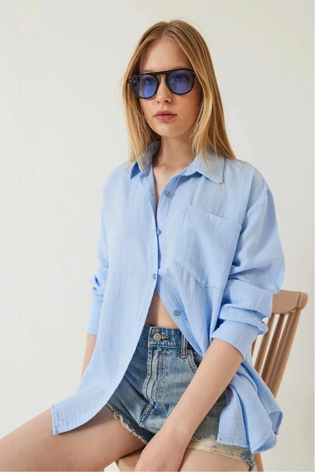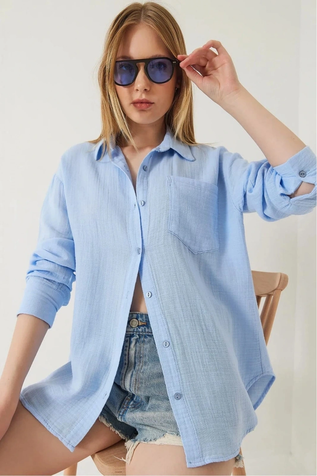 Tek cepli müslin gömlek mavi pt