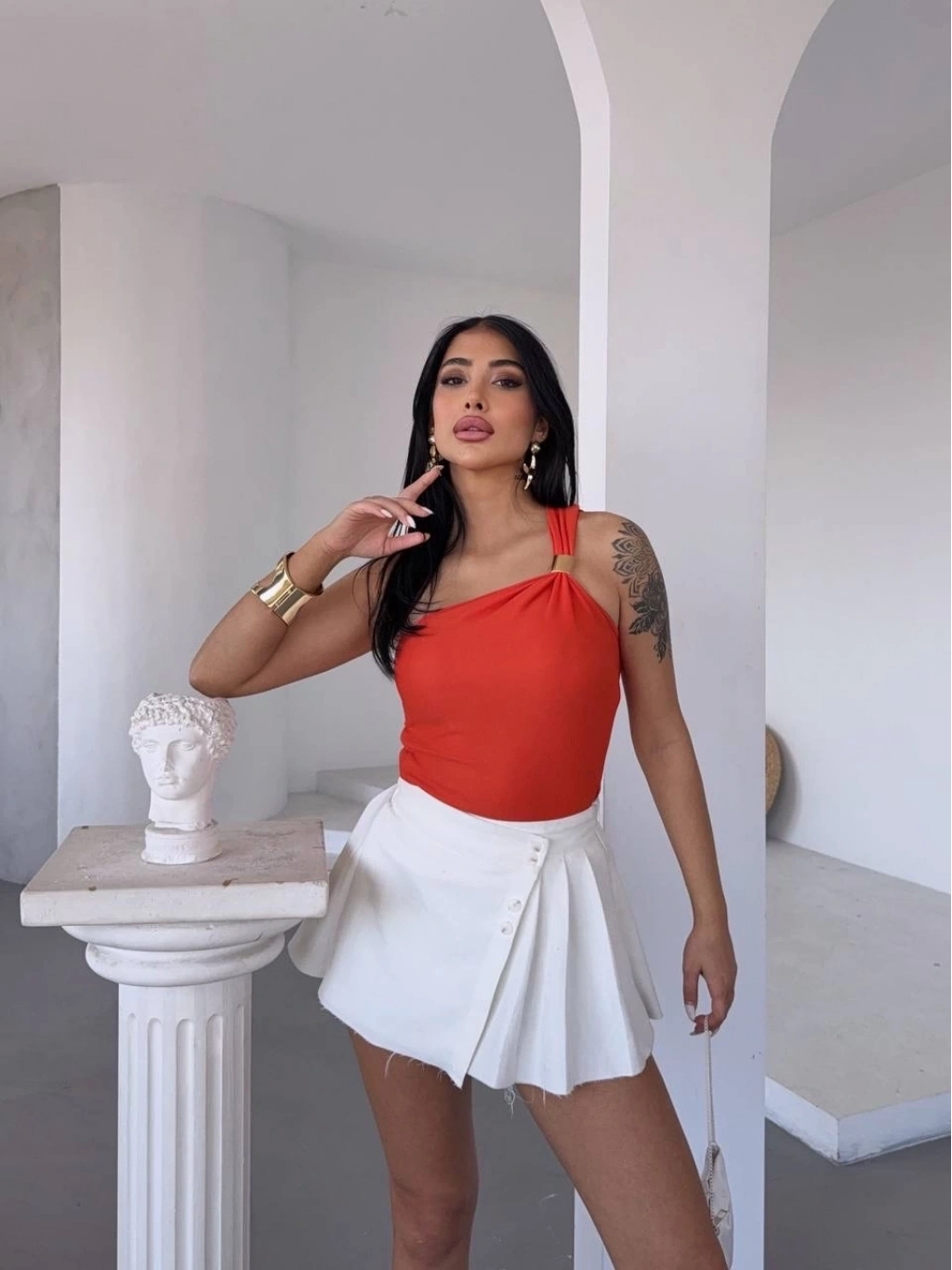 - Tek omuzlu tasarımı ile fark yaratan bir görünüm sunar.