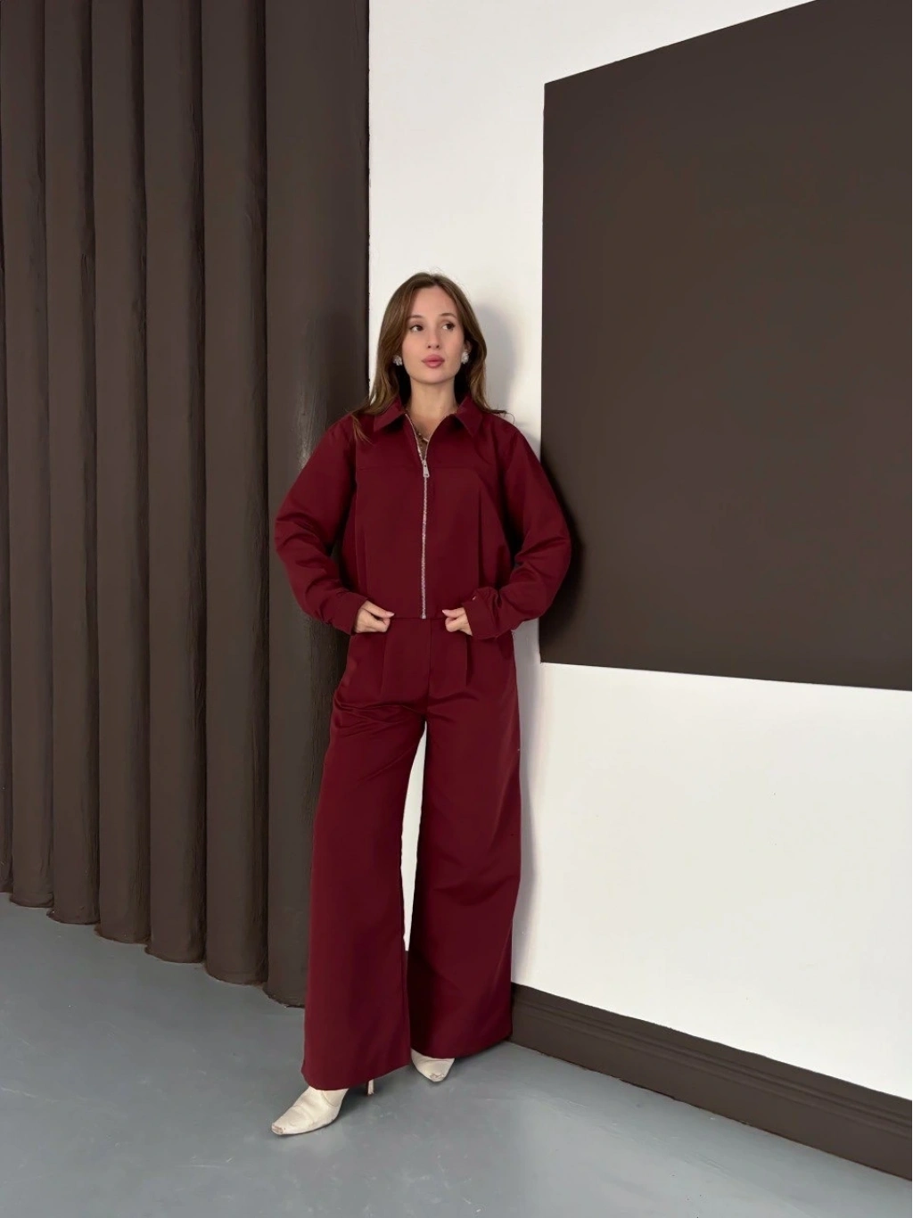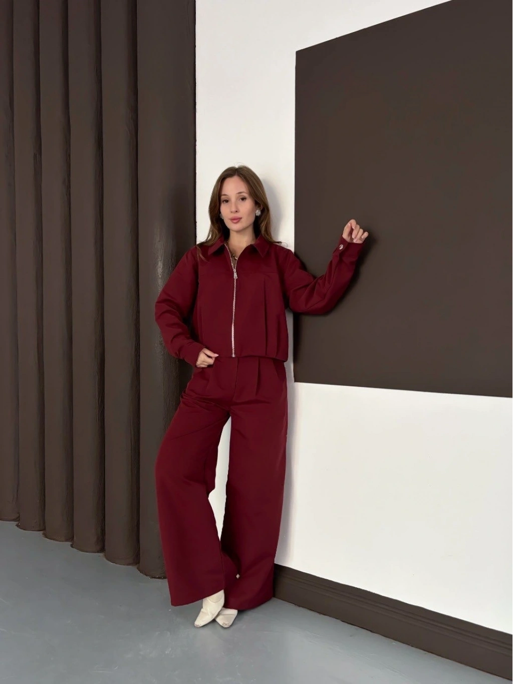 Fermuar detayıyla modern bir hava katan Trenç Takım Alt Üst Bordo Ons, kaliteli kumaşıyla da dikkat çekiyor.