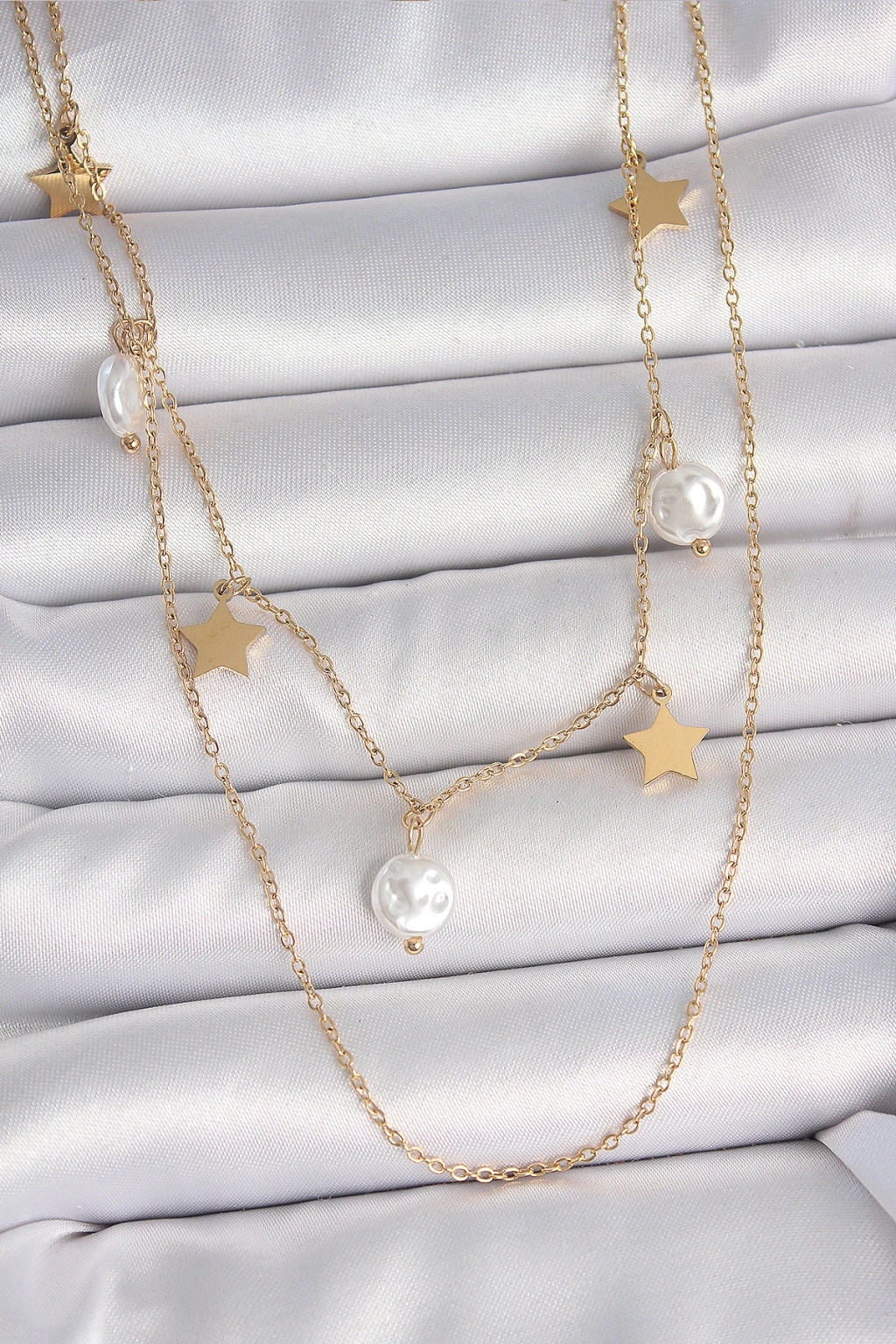 ® 316L Çelik Gold Renk 2'Li Zincir Sallantı Yıldız İnci Model Kadın Kolye