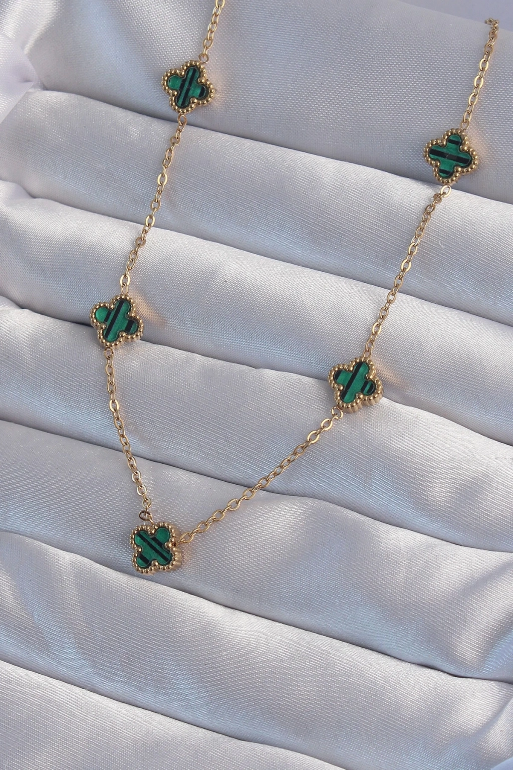 ® 316L Çelik Gold Renk Minimal Yeşil Mineli Yonca Kolye
