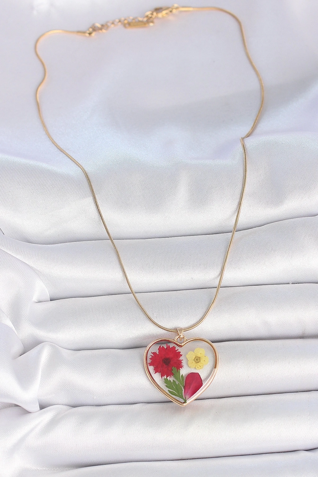 ® 316L Çelik Gold Renk Zincir Epokis Kalp Doğal Çiçek Model Kadın Kolye