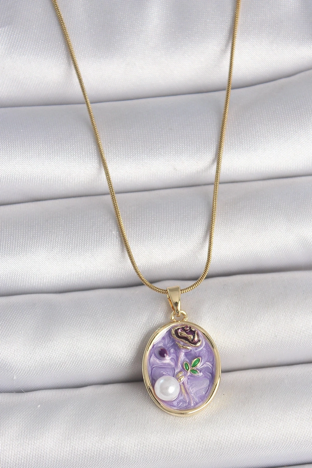 ® 316L Çelik Gold Renk Zincir Mor Çiçek İşlemeli İnci Detay Portre Model Kadın Kolye