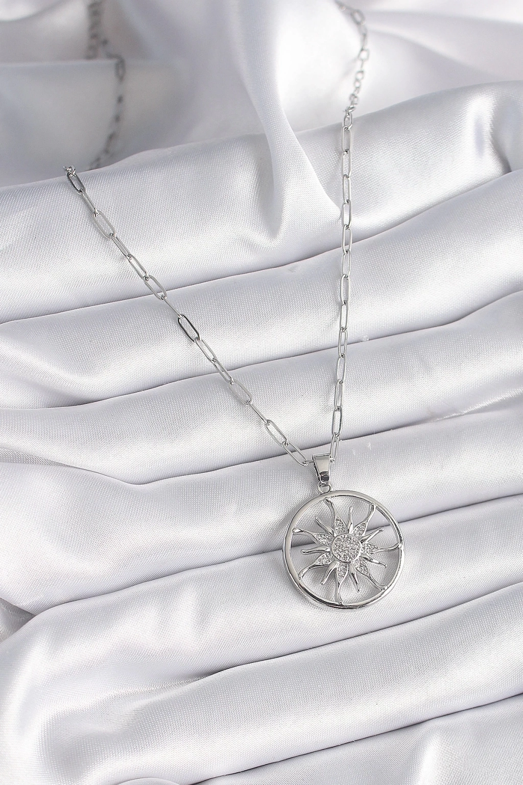 ® 316L Çelik Gümüş Renk Zirkon Taşlı Güneş Madalyon Model Kadın Kolye