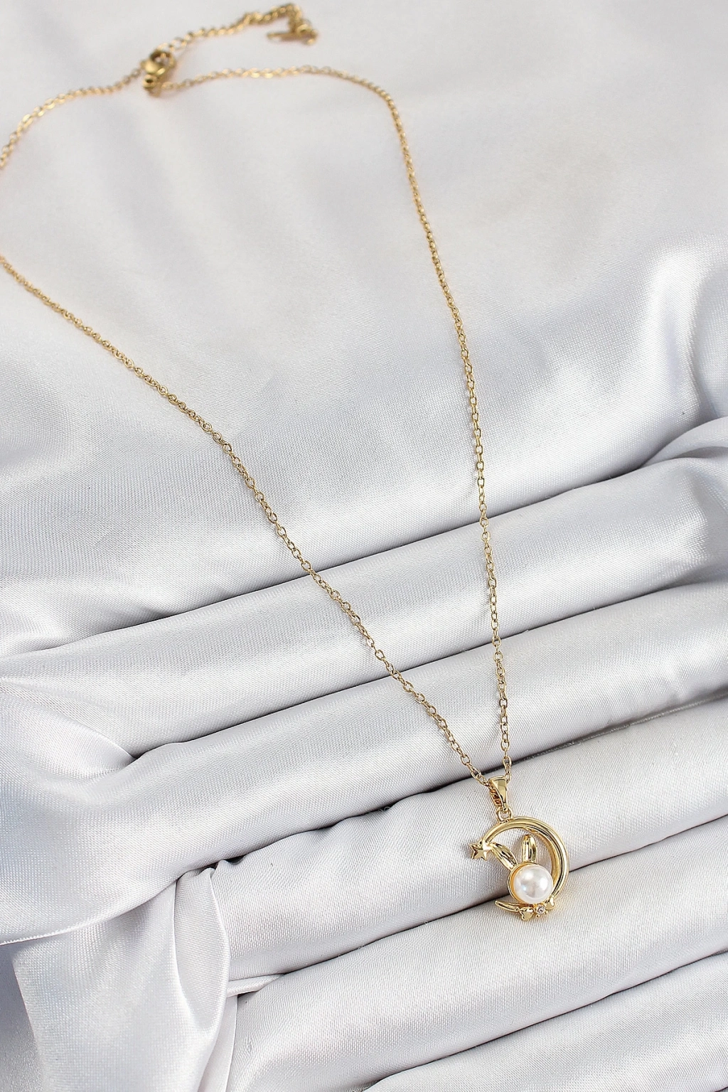 ® 316L Çelik İnci Detaylı Hilal Tavşan Model Gold Renk Kadın Kolye