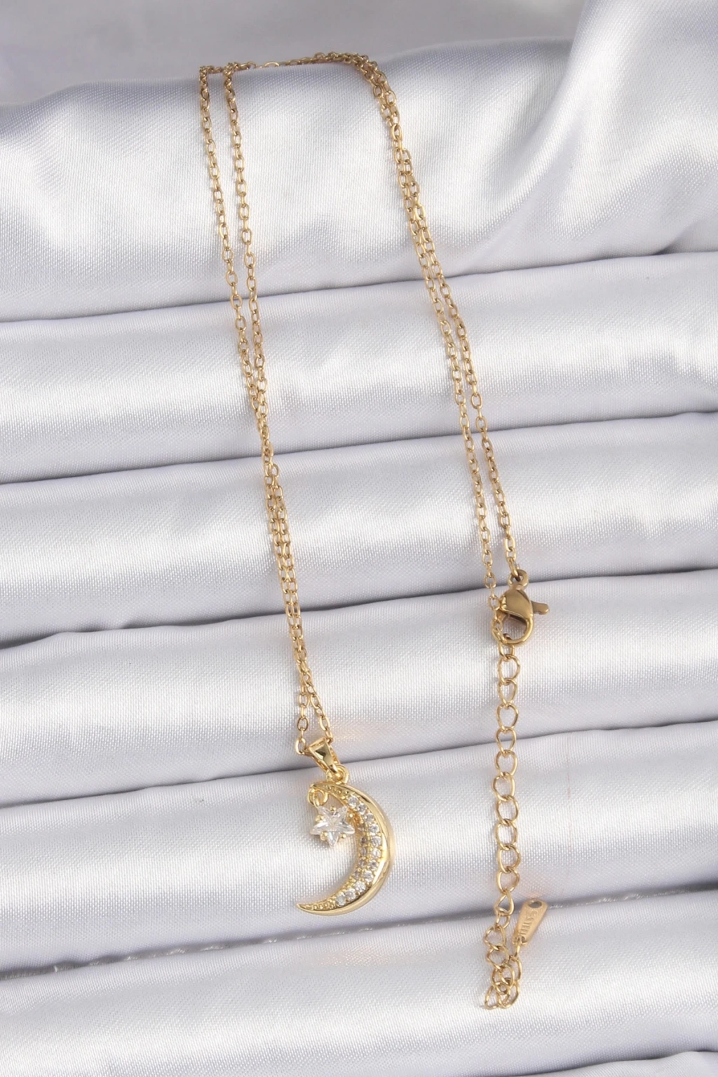 ® 316L Çelik Zincir Altın Renk Zirkon Taşlı Sallantılı Ay Yıldız Kolye