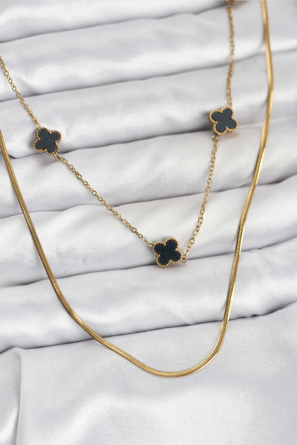 ® 316L Çelik Zincir Gold Renk İtalyan Zincirli Siyah Yonca Model Kadın Kolye