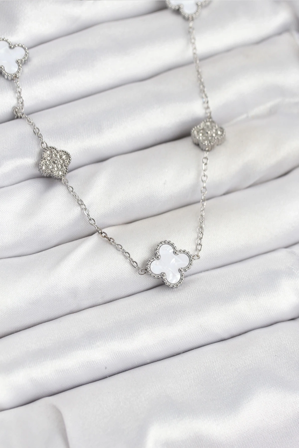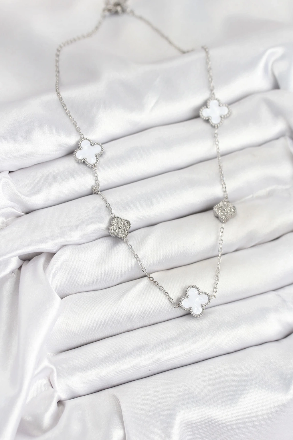 ® 316L Çelik Zincir Gümüş Renk Beyaz ve Zirkon Taşlı Yonca Kadın Kolye