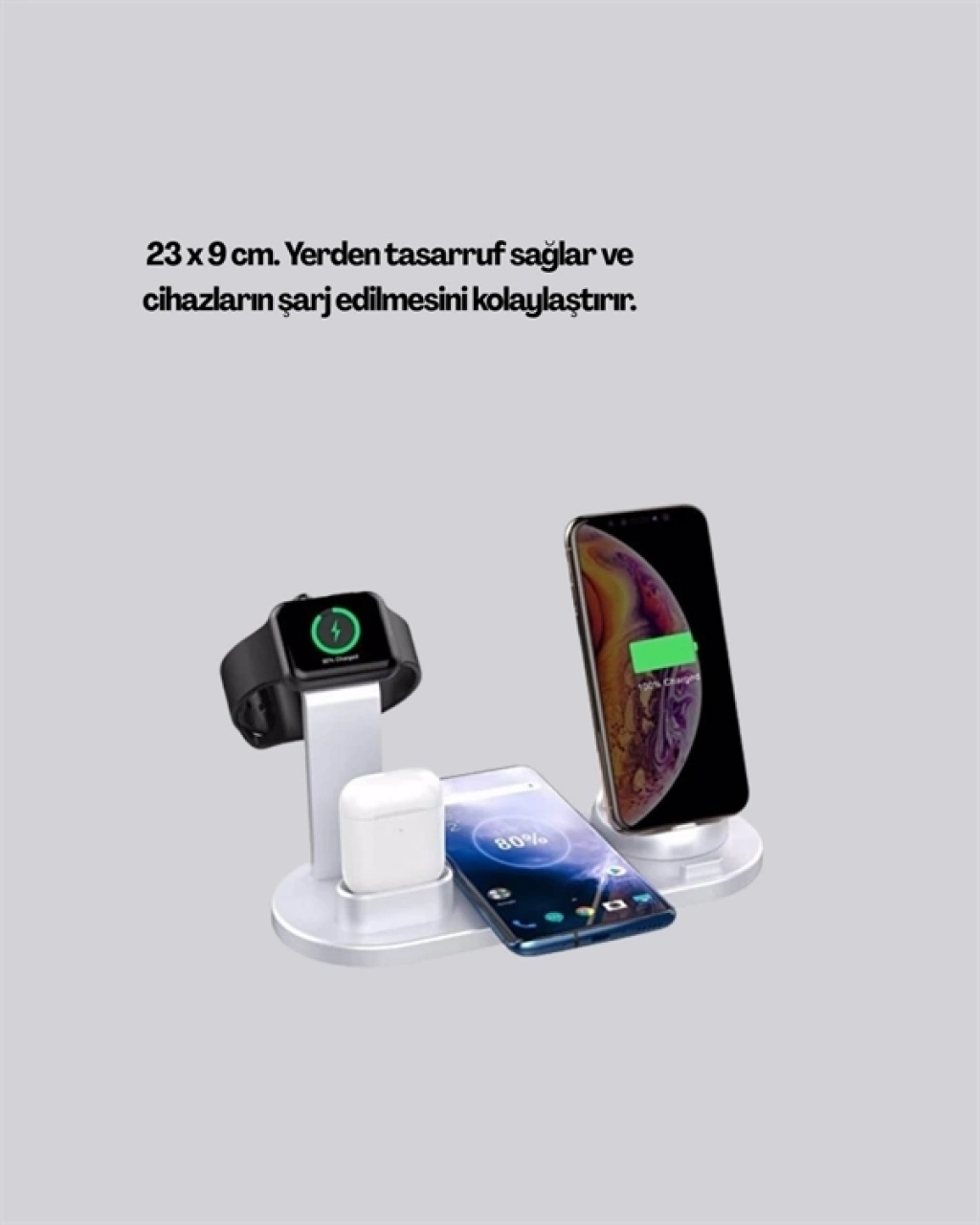Bu kablosuz şarj ünitesi, yalnızca Apple değil, aynı zamanda Android kullanıcıları için de uygundur. Cihaz, Micro USB, Type-C ve Lightning bağlantı destekli her türlü akıllı telefonla uyumlu döner bağlantı noktalarına sahiptir. Böylece Samsung, Huawei, Xiaomi gibi markaların cihazları da güvenle şarj edilebilir.Üçlü şarj standı 360 derece dönebilen tasarımıyla cihaz yerleştirmeyi kolaylaştırır. Ayrıca arkada bulunan USB port sayesinde ekstra bir cihaz daha kablolu olarak şarj edilebilir. Kaymaz tabanı sayesinde masa üzerinde sabit kalır, cihazlarınızı düşme riskinden korur.23 x 9 cm ölçülerindeki kompakt formu sayesinde masaüstü kullanımı için idealdir. Şarj esnasında telefonunuzu dik şekilde kullanabilir, video izleyebilir, aramalar yapabilirsiniz. Aynı anda verimlilik ve konfor sunan şık bir şarj çözümüdür.